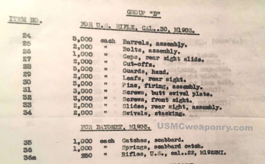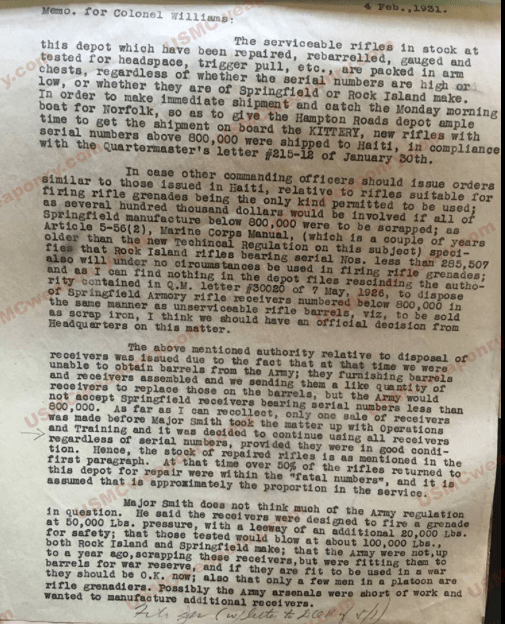 In 1926 the Marine Corps needed barrels for overhaul, but Springfield Armory and Rock Island Arsenal had none available. It was agreed that the Marines would instead send in worn out barreled receivers for a partial credit, and receive a fresh barreled receiver in exchange. As receiver hardness issues were now being addressed, Springfield Armory would only send barreled receivers made later than serial number 800,000 or those made by Rock Island Arsenal, as it was initially believed the heat treatment deficiencies were unique to Springfield Armory. This plan would be amended before any exchanges took place, as further examination found Rock Island Arsenal receivers to be just as faulty. The updated exchange policy would deem Rock Island Arsenal receivers under serial number 285,507 as unsatisfactory. All Marine M1903 “Unders” as the Marines called them would be turned in for no credit whatsoever, and would be replaced at cost with an “Over” barreled receiver. Today, Over and Under receivers are most commonly referred to as “high number” and “low number”, respectively. When encountering a Marine rebuilt M1903, the likelihood of finding one in the high number range is far greater, certainly due to this exchange. At minimum 10,000 barreled receivers were exchanged, with about two thirds of those sent in by the Marines being low serial numbers. Unfortunately for collectors, many of the low numbers exchanged would have been veterans of World War I combat, thus reducing the likelihood of coming across an example today. On top of the exchanges, one auction of an unknown amount of low number receivers was held by the Marine Corps, as indicated by National Archives documentation.