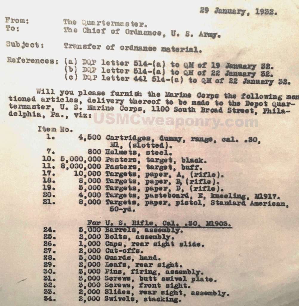 One of many order forms sent from the Quartermaster of the USMC Depot of Supplies in Philadelphia to Springfield Armory. After long campaigns in Nicaragua and Haiti, the Marines were once again in need of barrels, stocks, and small parts (NARA).