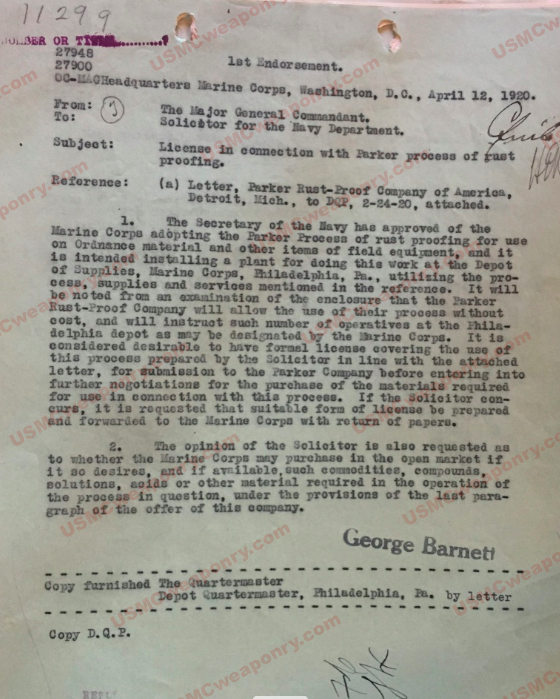 Parkerizing would dramatically increase finish durability and longevity, with the Marine Corps adopting it following WWI (NARA).