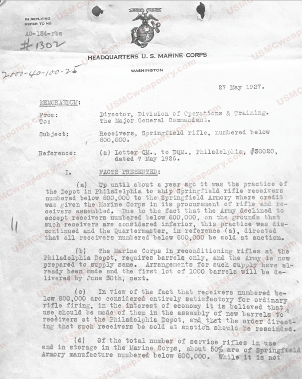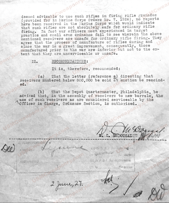 Directive to auction off low number M1903 receivers, referred to by the Marine Corps as “Under’s” in correspondence (NARA).