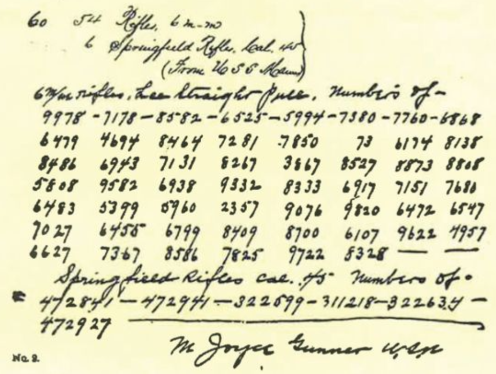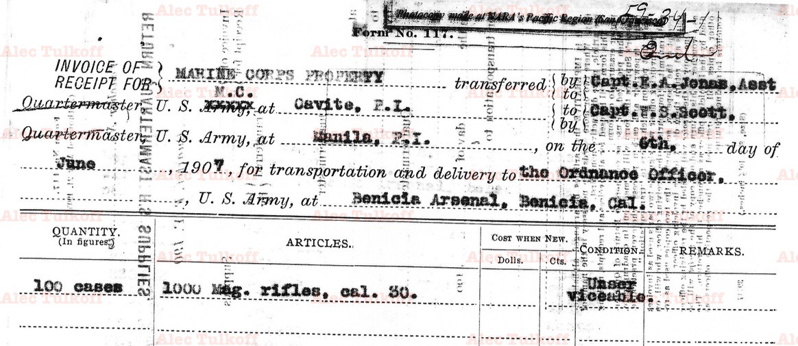 Springfield Armory M1898 Krag-Jorgensen Rifles #231425 and #257294 are two of a thousand transferred from Marines in the Philippines to the Marine ordnance officer at Benecia Arsenal in California. These 1000 rifles were sent back stateside after the end of the Philippine insurrection. As of now, less than ten USMC provenance M1898 Rifles to have been identified (documents: Alec Tulkof, rifles: Anderson & Plowman collections).