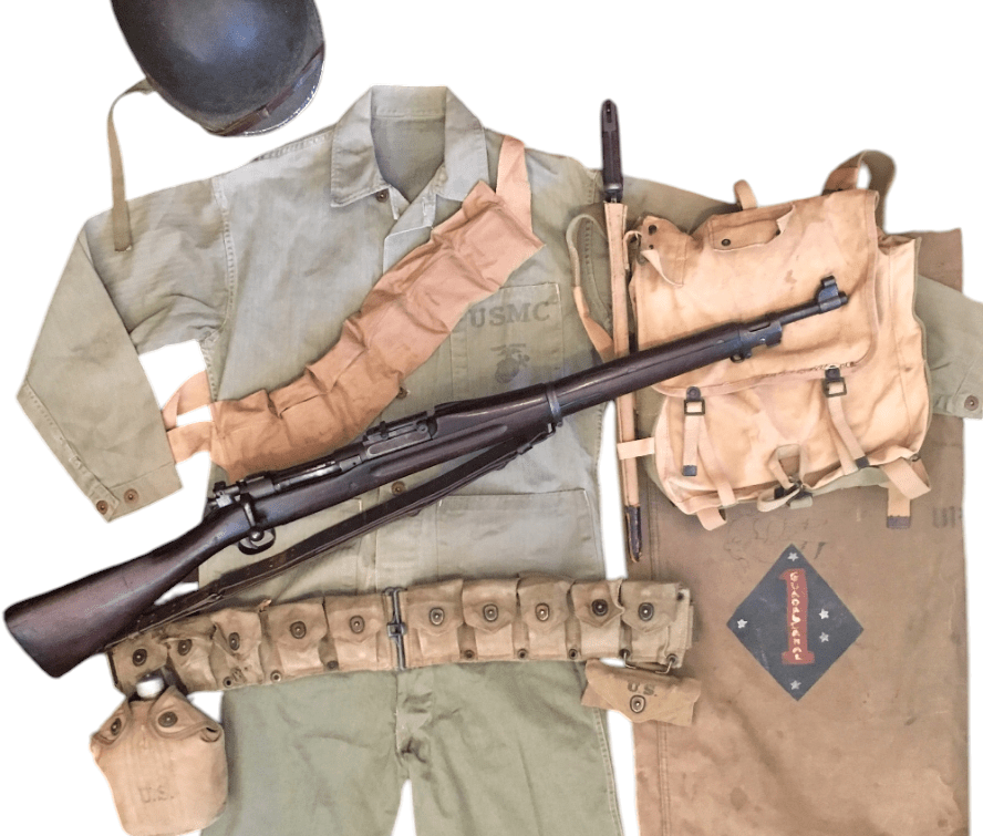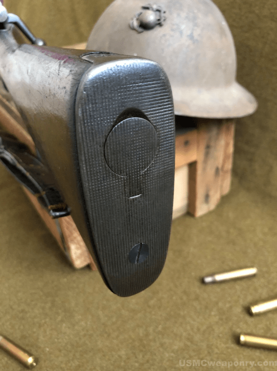 USMC Springfield Armory M1903 #840216, brought home following the Guadalcanal Campaign by H Company, 2nd Battalion, 5th Marines Platoon Sergeant Roy Jowers. Following the conclusion of the 1st Marine Division’s Guadalcanal combat operations, Platoon Sergeant Jowers was transferred back to Camp Pendleton to instruct at the School of Infantry. Platoon Sergeant Jowers was tasked with transporting his company’s old M1903 rifles stateside as they had been replaced with the new M1 Garand in Australia. #840216 bears a variety of early/mid 1930’s rebuild traits. It has an SA 3-32 barrel, .40 height numbered front sight, and a checkered buttplate (Plowman collection).