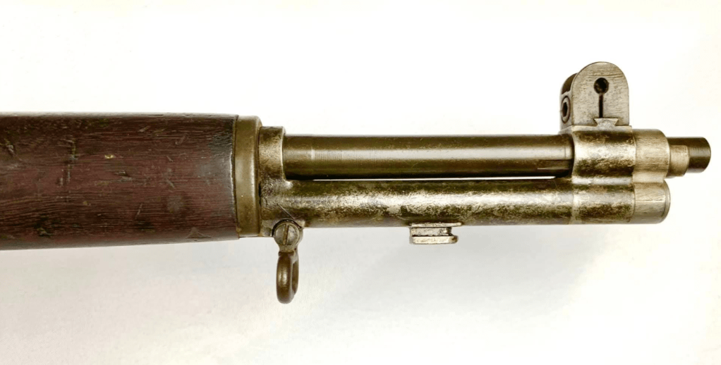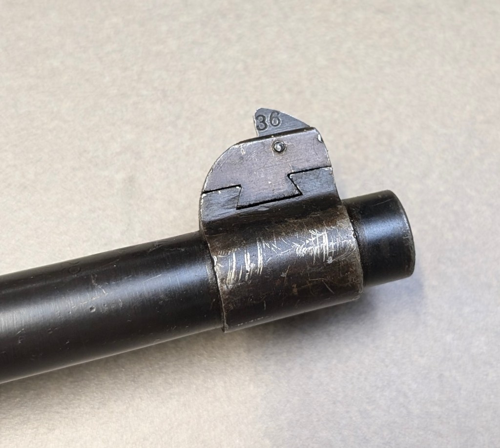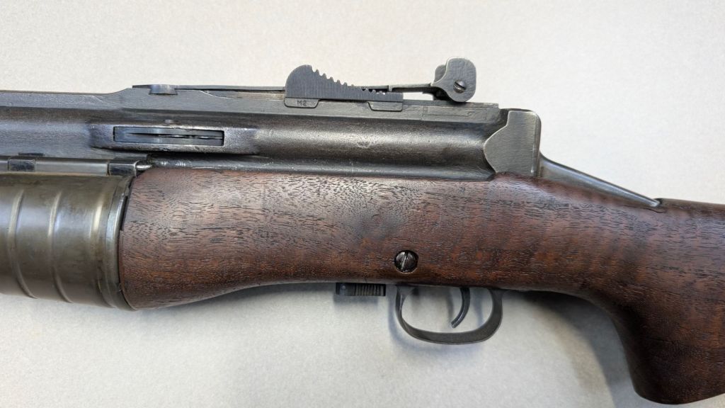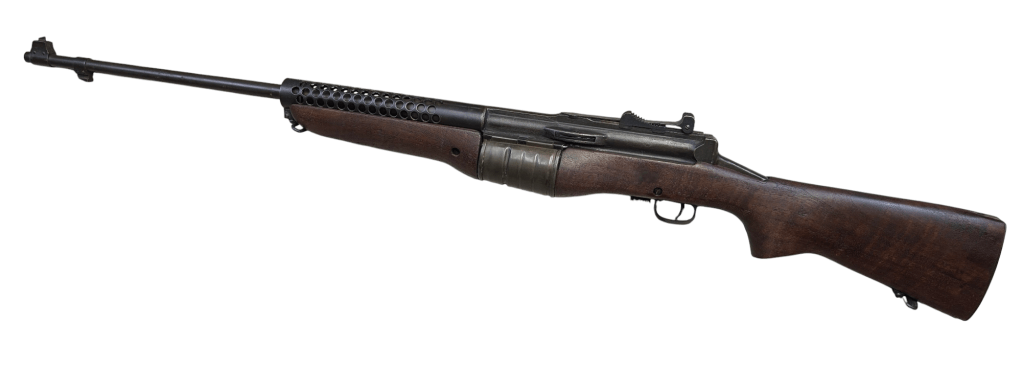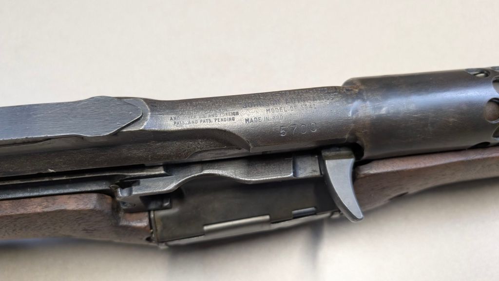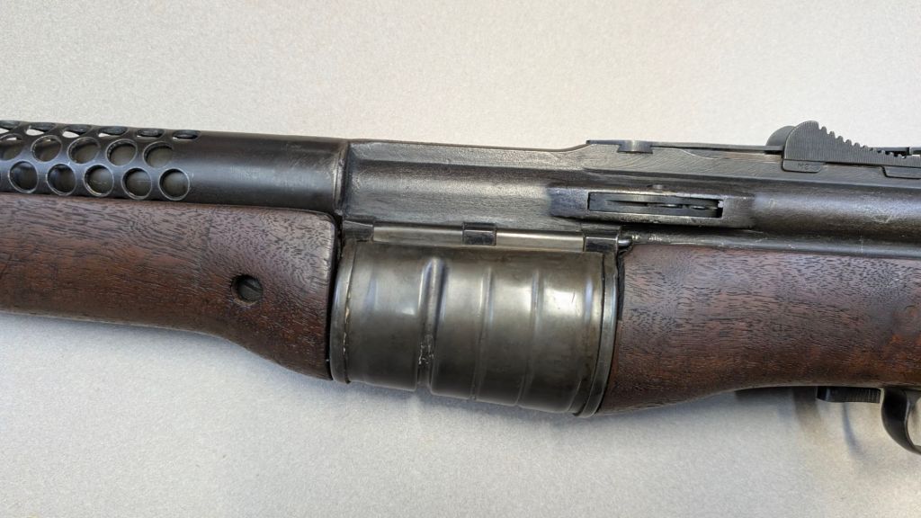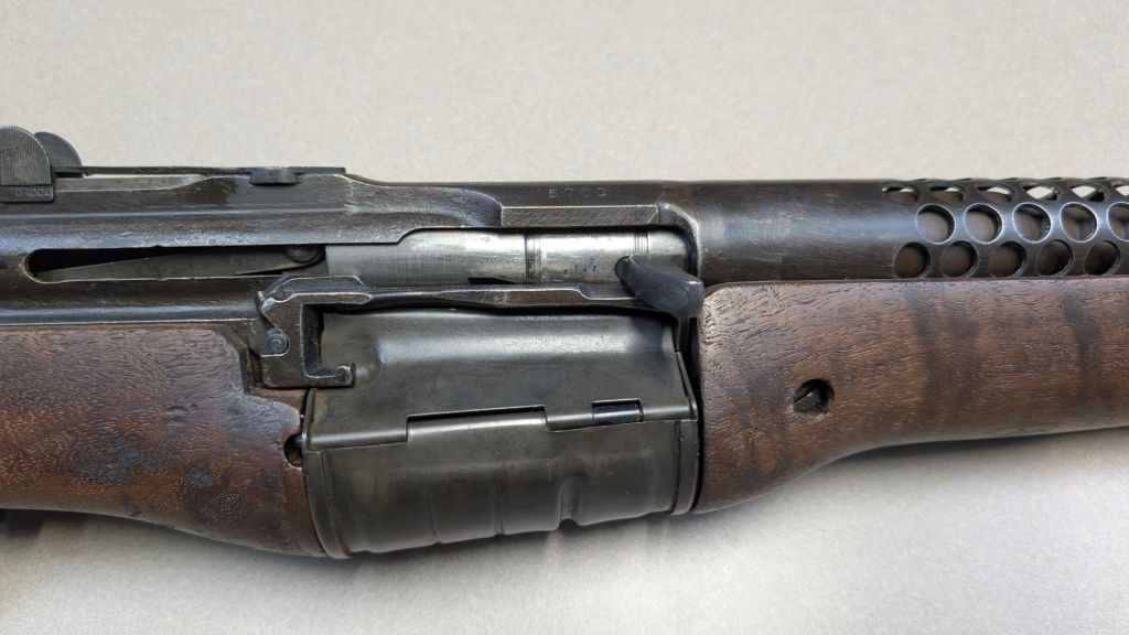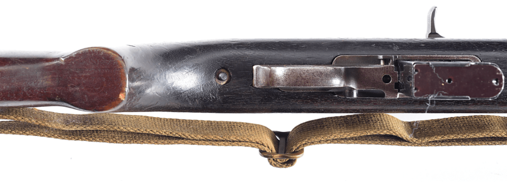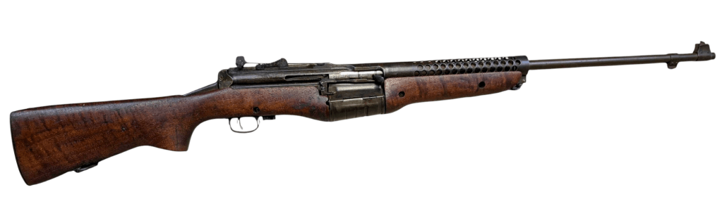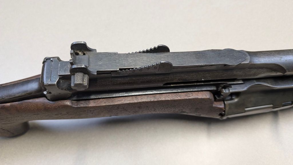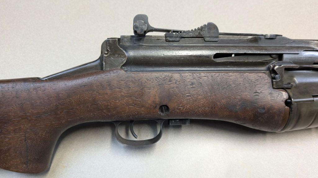 Prior to deploying for the Guadalcanal Campaign, the 1st Marine Parachute Battalion was given twenty-three M1941 Johnson Rifles by Captain Melvin Johnson for use during combat operations. Initially considered a loan, the serial numbers of these rifles were retained by the Johnson Automatics company. While the M1941 may not have been chosen as the standard issue battle rifle for American troops in WWII, it was an excellent rifle for paratroopers. The elite “Paramarines” were given special considerations when it came to weapons, much like the fabled Marine Raiders. The twenty-three Johnson rifles would be put to good use on Guadalcanal, participating in famous stands like the Battle for Edson’s Ridge. #5700 is one of four of the twenty-three known to exist today. Two are on display at the National Museum of the Marine Corps, and two are in the hands of private collectors. #5700 bears some interesting modifications, some long associated with Marine Corps weapons in WWII. The rear sight aperture has been modified from a circular peep into a V-cut, and the barrel has had the sight ears removed. The original circular charging handle has been replaced with a custom made one similar to an M1 Garand or BAR as well, the first example of such. As of now, #5700 and the other three M1941s are the only rifles documented to the Guadalcanal Campaign. (Plowman collection).
