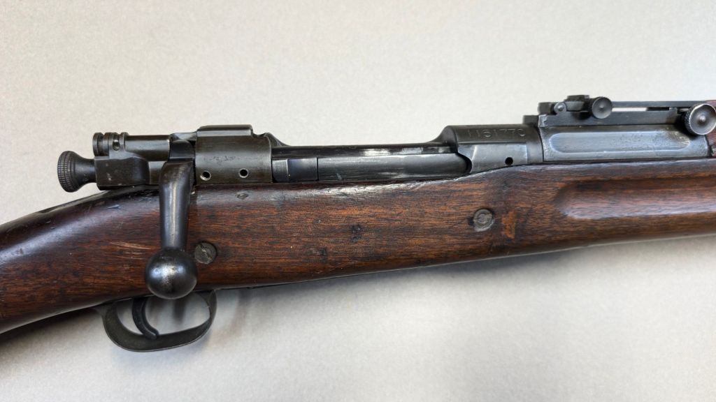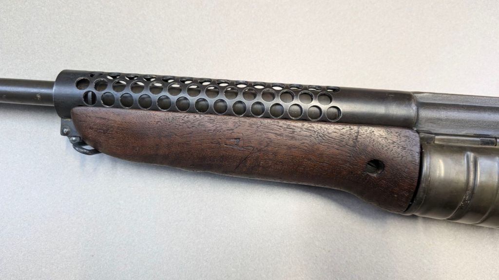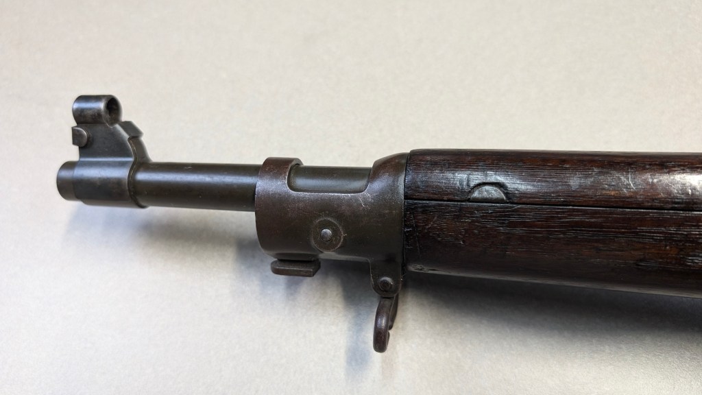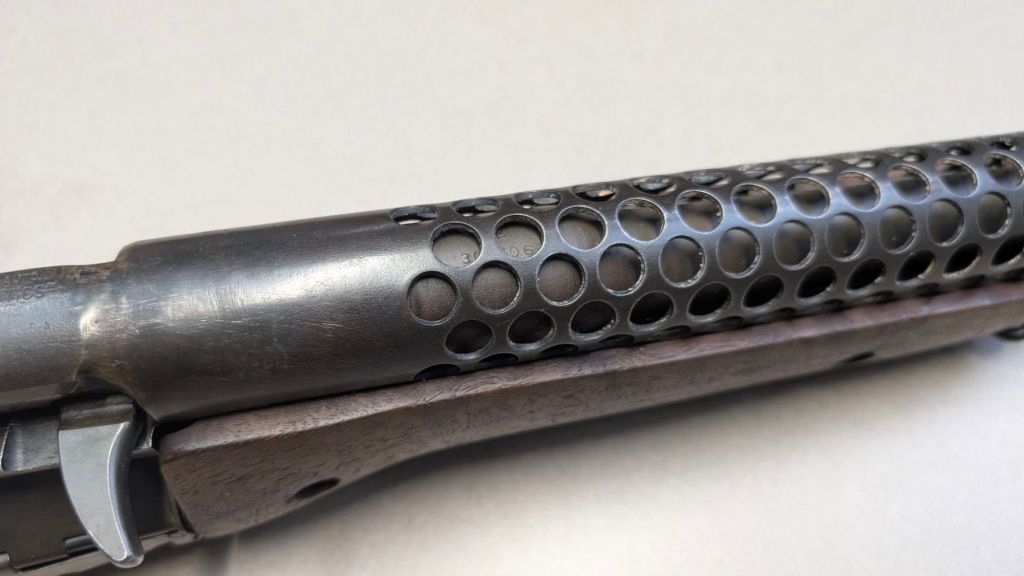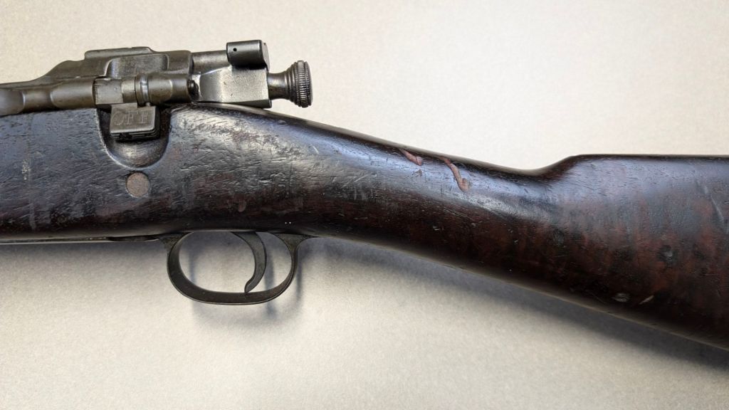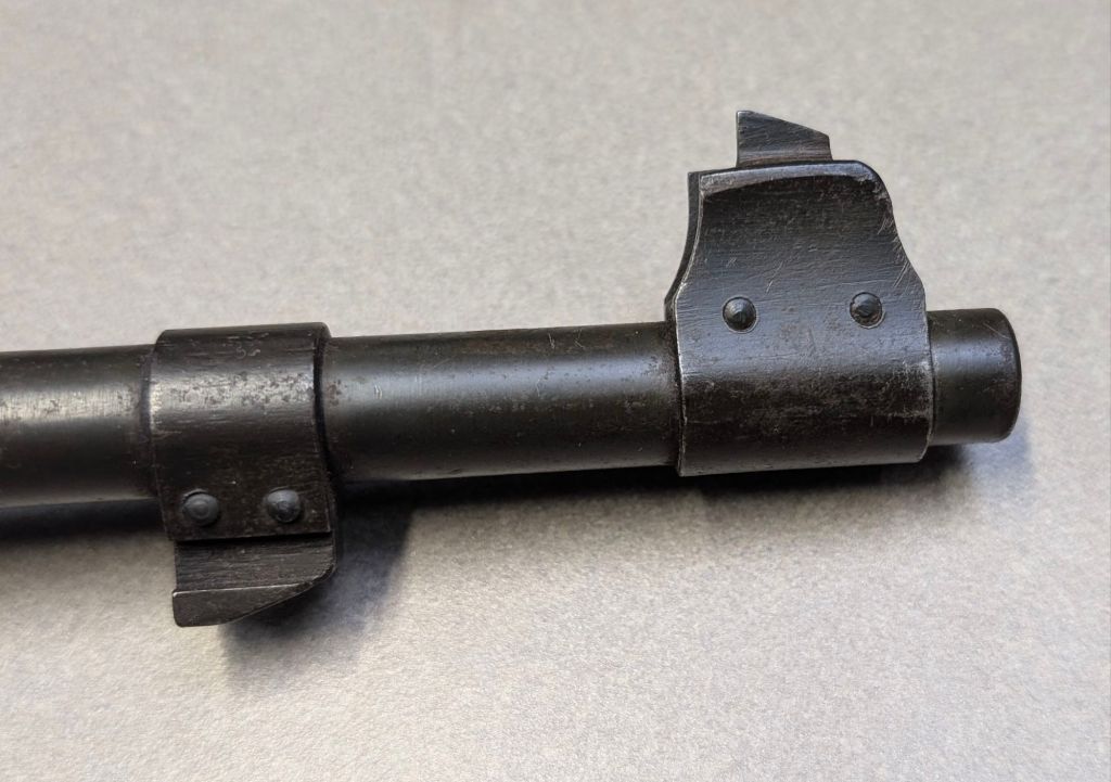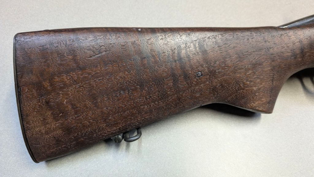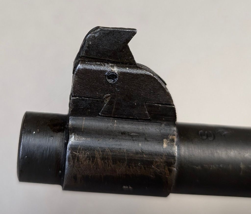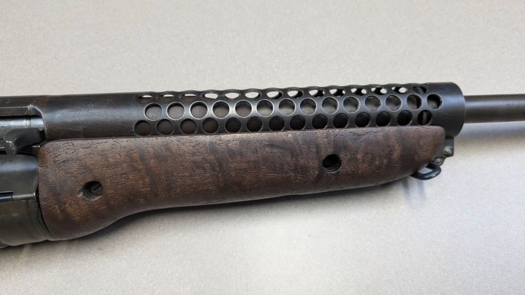Prior to deploying for the Guadalcanal Campaign, the 1st Marine Parachute Battalion was given twenty-three M1941 Johnson Rifles by Captain Melvin Johnson for use during combat operations. Initially considered a loan, the serial numbers of these rifles were retained by the Johnson Automatics company. While the M1941 may not have been chosen as the standard issue battle rifle for American troops in WWII, it was an excellent rifle for paratroopers. The elite “Paramarines” were given special considerations when it came to weapons, much like the fabled Marine Raiders. The twenty-three Johnson rifles would be put to good use on Guadalcanal, participating in famous stands like the Battle for Edson’s Ridge. #5700 is one of four of the twenty-three known to exist today. Two are on display at the National Museum of the Marine Corps, and two are in the hands of private collectors. #5700 bears some interesting modifications, some long associated with Marine Corps weapons in WWII. The rear sight aperture has been modified from a circular peep into a V-cut, and the barrel has had the sight ears removed. The original circular charging handle has been replaced with a custom made one similar to an M1 Garand or BAR as well, the first example of such. As of now, #5700 and the other three M1941s are the only rifles documented to the Guadalcanal Campaign. (Plowman collection).