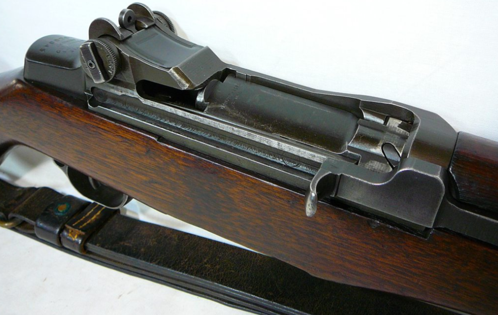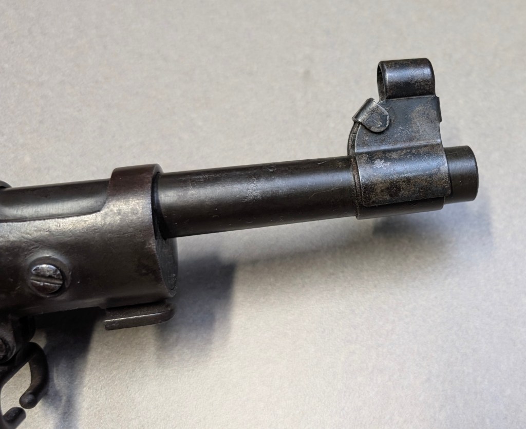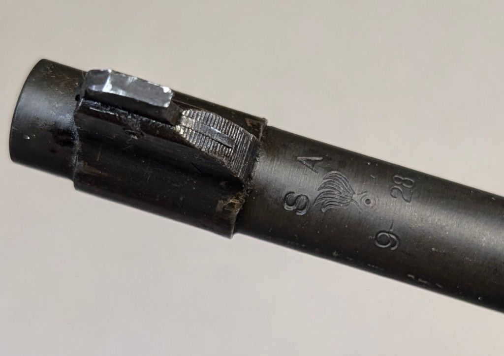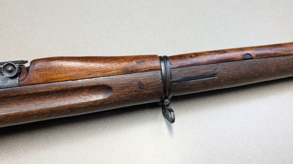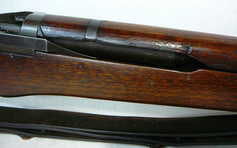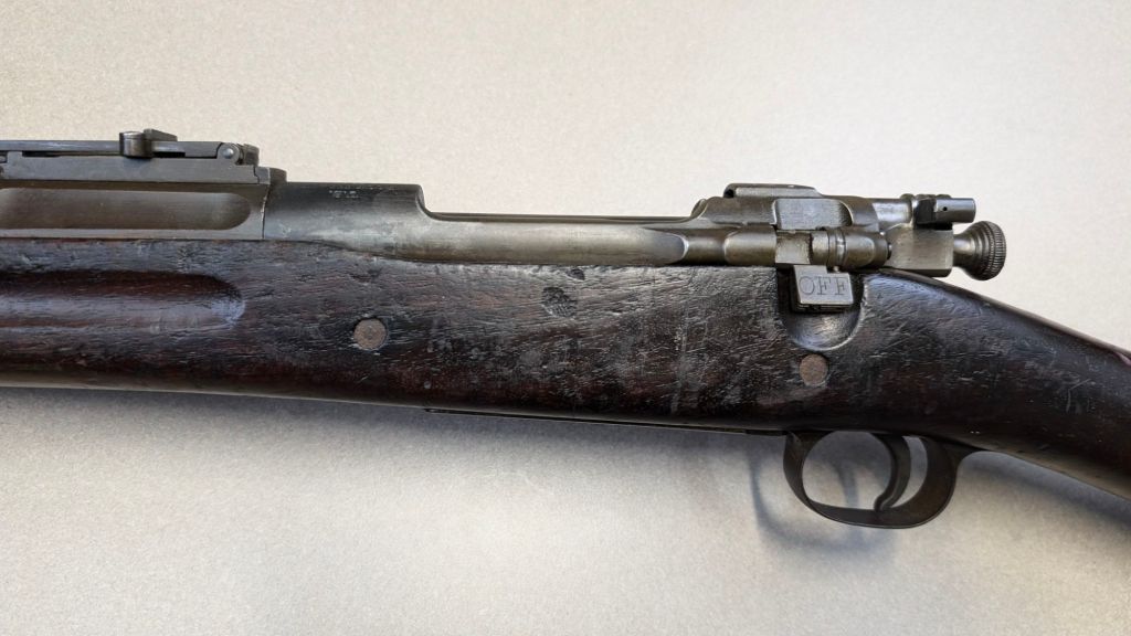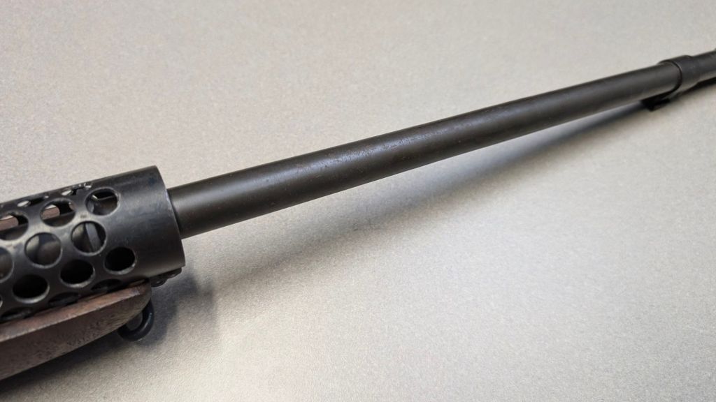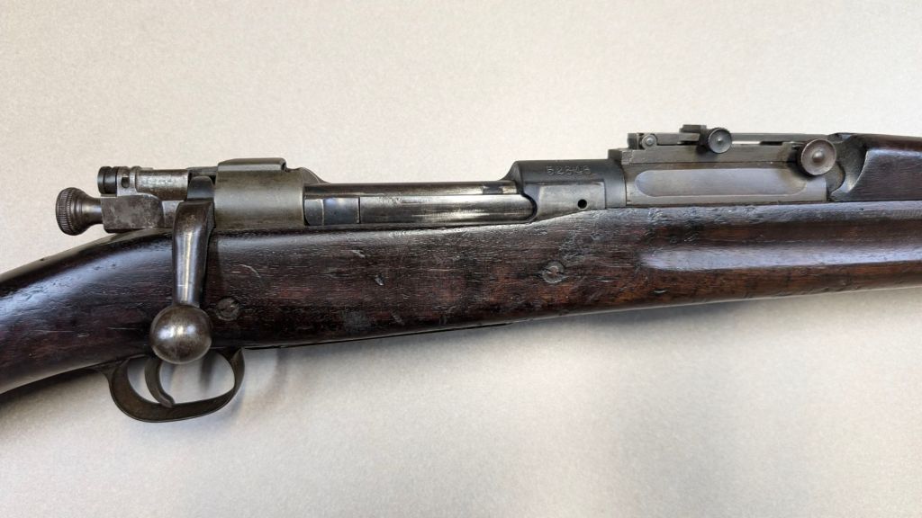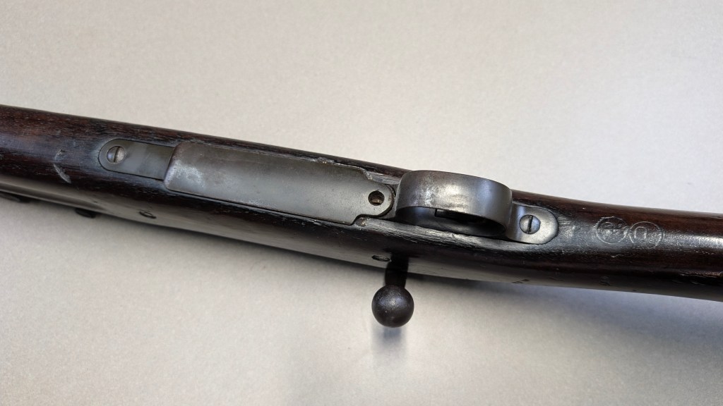 Prior to deploying for the Guadalcanal Campaign, the 1st Marine Parachute Battalion was given twenty-three M1941 Johnson Rifles by Captain Melvin Johnson for use during combat operations. Initially considered a loan, the serial numbers of these rifles were retained by the Johnson Automatics company. While the M1941 may not have been chosen as the standard issue battle rifle for American troops in WWII, it was an excellent rifle for paratroopers. The elite “Paramarines” were given special considerations when it came to weapons, much like the fabled Marine Raiders. The twenty-three Johnson rifles would be put to good use on Guadalcanal, participating in famous stands like the Battle for Edson’s Ridge. #5700 is one of four of the twenty-three known to exist today. Two are on display at the National Museum of the Marine Corps, and two are in the hands of private collectors. #5700 bears some interesting modifications, some long associated with Marine Corps weapons in WWII. The rear sight aperture has been modified from a circular peep into a V-cut, and the barrel has had the sight ears removed. The original circular charging handle has been replaced with a custom made one similar to an M1 Garand or BAR as well, the first example of such. As of now, #5700 and the other three M1941s are the only rifles documented to the Guadalcanal Campaign. (Plowman collection).