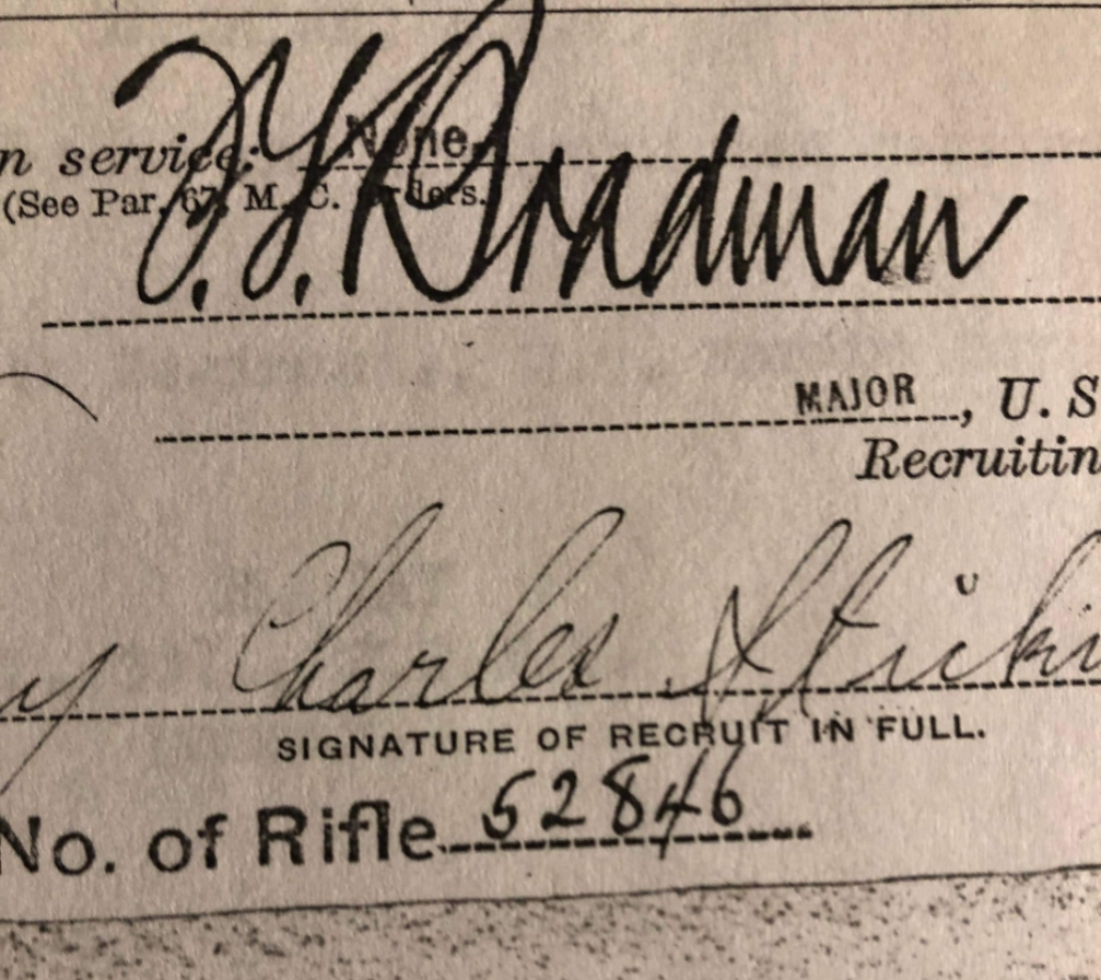 To date, only one Belleau Wood documented M1903 has been located, the rifle carried by Sergeant Guy Charles Stickney. Sergeant Stickney served with 18th Company, 2nd Battalion, 5th Marine Regiment. At Belleau Wood, Sergeant Stickney would be wounded multiple times, as well as awarded the Silver Star for his actions. The vast majority of his peers who went into battle with him would not make it home alive. Sergeant Stickney’s service record book shows he was issued Model 1903 serial number 52846. This rifle was found in poor condition, a sporterized Rock Island Arsenal M1903 with USMC traits bearing an incredible serial number. The rifle had been parkerized following World War I, so it was restored to how it would have looked during the interwar years, complete with the USMC #10 sights that were used by the Marines from 1919 until 1935. Sergeant Stickney’s service record book did not denote whether he was issued a Springfield Armory or Rock Island Arsenal made M1903, as the Marine Corps never distinguished between the two. However, over the course of many years of compiling USMC serial numbers it is clear the odds are overwhelming that he carried this Rock Island Arsenal made M1903. Through documentation and known examples, many USMC Rock Island Arsenal M1903s with very close serial numbers to this rifle have been found, while the nearest Springfield Armory M1903 serial numbers are tens of thousands away. Coupled with the USMC traits the rifle was found with, this was indeed the M1903 issued to Sergeant Stickney (Plowman collection).