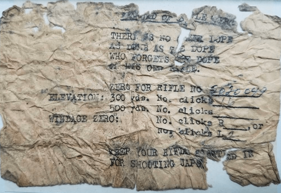 #2020049 has a worn SA 10-43 barrel and SA EMcF cartouched stock with USMC depot made sling. Internally, the rifle retains traces of volcanic sand. Inside the stock a small DOPE tag was found, with the windage and elevation zeroes for the Marine who carried this incredible rifle into combat. Due to serial number proximity and the location in which this rifle was found, it is believed that #2020049 was carried by a Gyrene from the 3rd Marine Division (Norton collection). Many years after bringing #2020049 home with him, Major Todd Moore would go on video with the rifle in order to preserve its history. A phenomenal bring back, #2020049 is the only USMC M1 Garand with firm ties to the Battle of Iwo Jima.