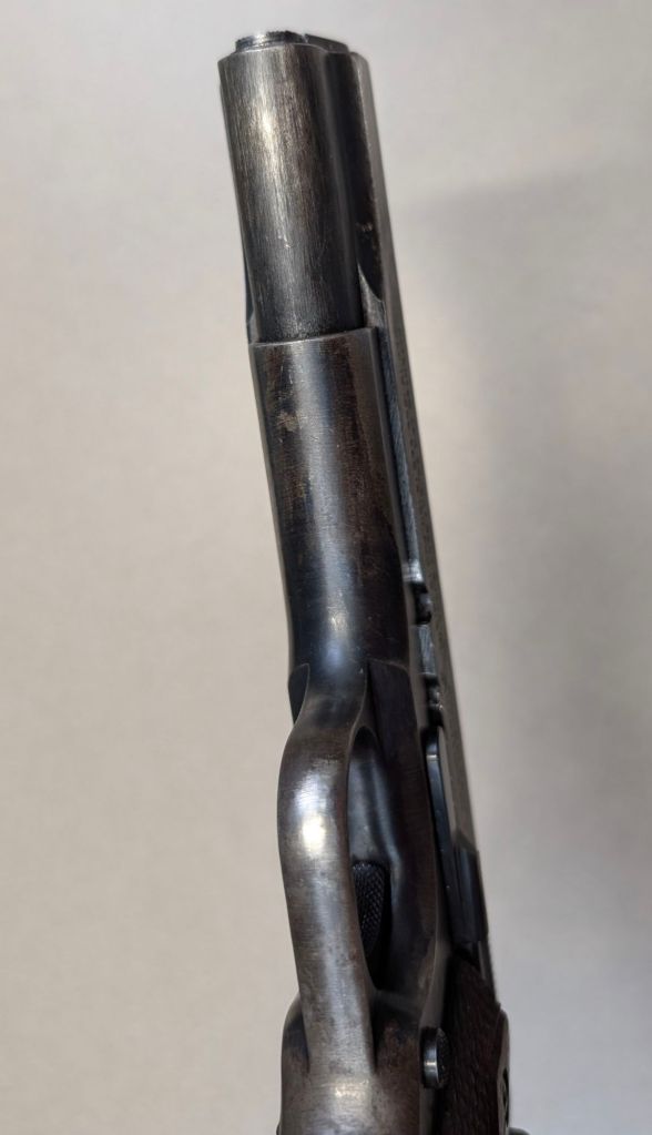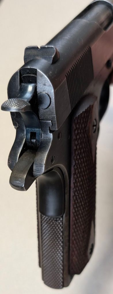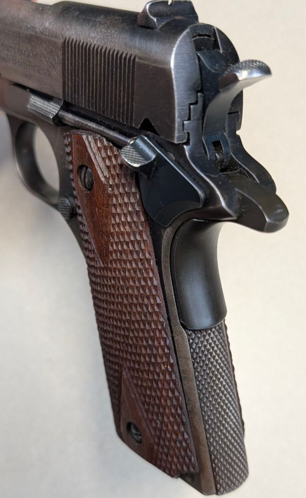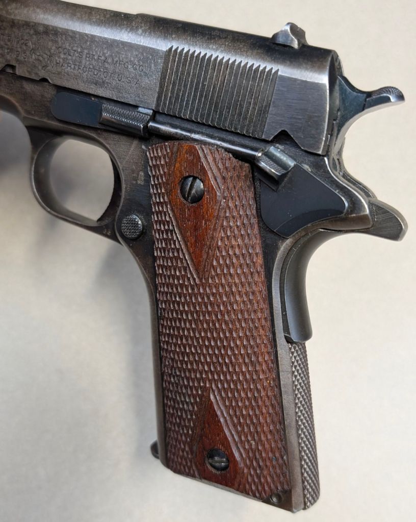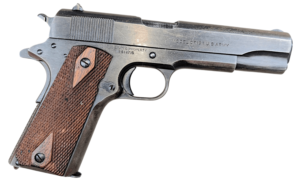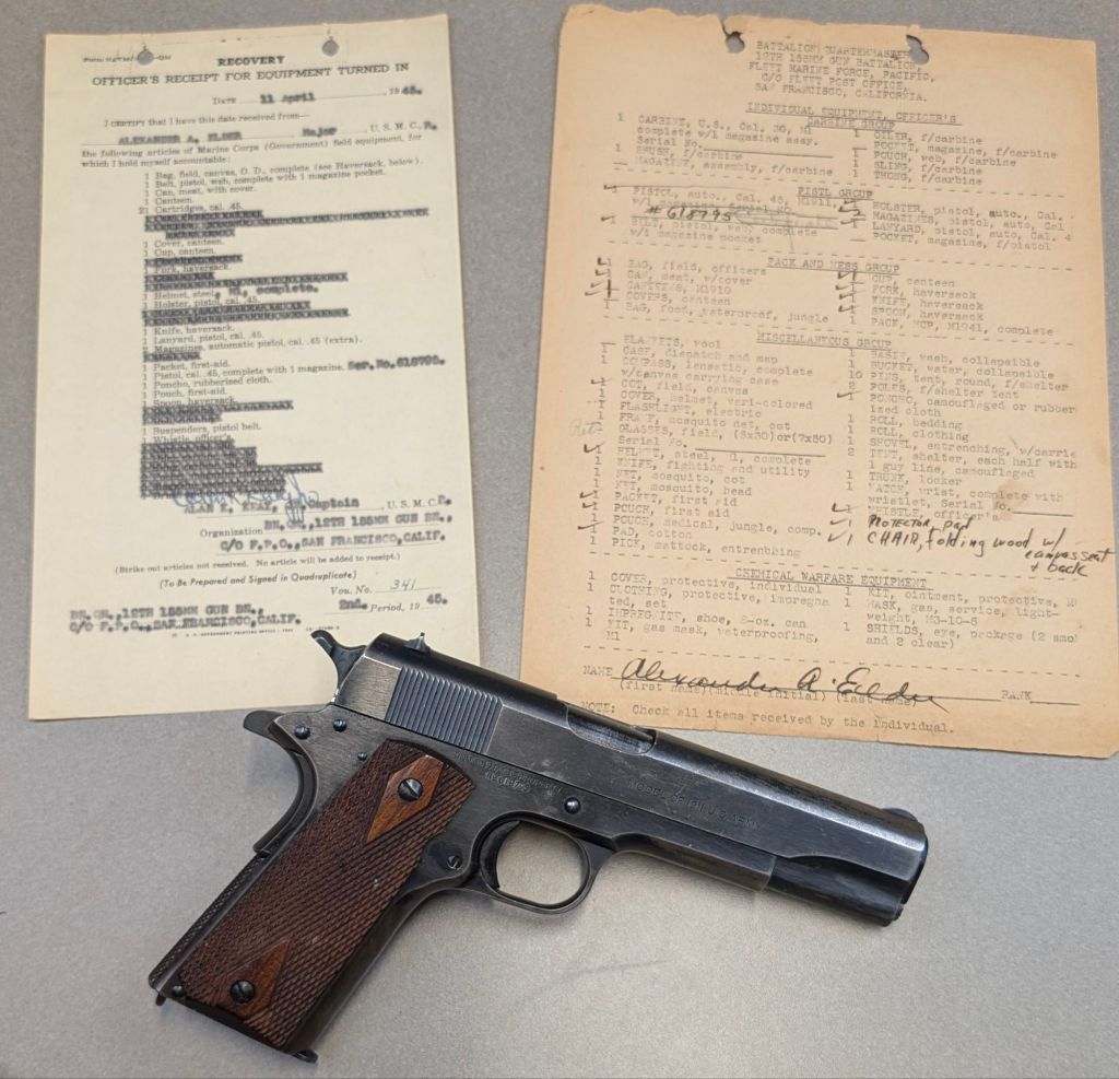 USMC Colt M1911 #618795 was issued to Major Alexander Elder, a Marine artillery officer upon his joining the 12th 155mm Gun Battalion in the fall of 1944. Renamed the 2nd 155mm Howitzer Battalion of the 1st Provisional Field Artillery Group for the invasion of Iwo Jima, Major Elder’s howitzer would serve as the battalion’s executive officer. Major Elder’s unit would provide heavy artillery support for the 3rd, 4th and 5th Marine Divisions during the battle, under constant enemy fire themselves.