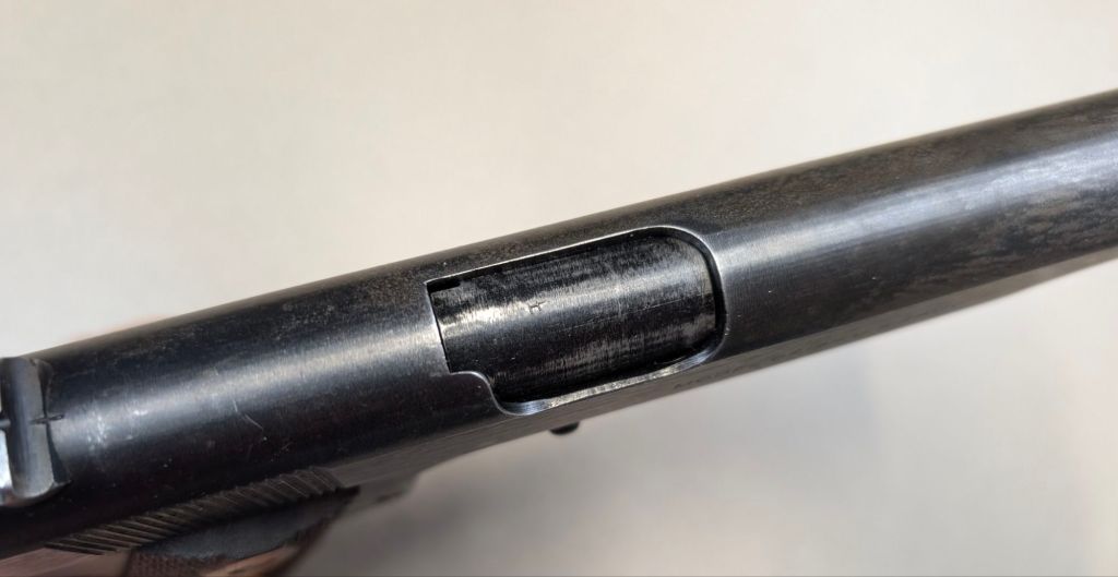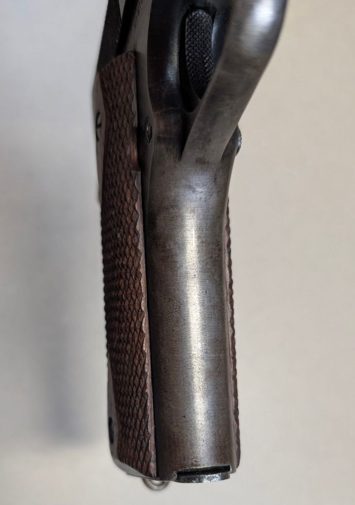 One of 10,700 Colt M1911s produced and sent to the Marine Corps in 1919, #618795 retains its original blued finish with some minor parts replacement during its subsequent decades of service. The trigger has been updated to a M1911A1 type and the grips were replaced, while the barrel remains original. The overall condition is nice considering the service this pistol saw. As World War II came to an end and Major Elder would see no further combat, he would be given the opportunity to purchase his M1911. Considering the original documentation #618795 possesses, this pistol is in exceptionally rare company as a battle documented Marine Corps Weapon.