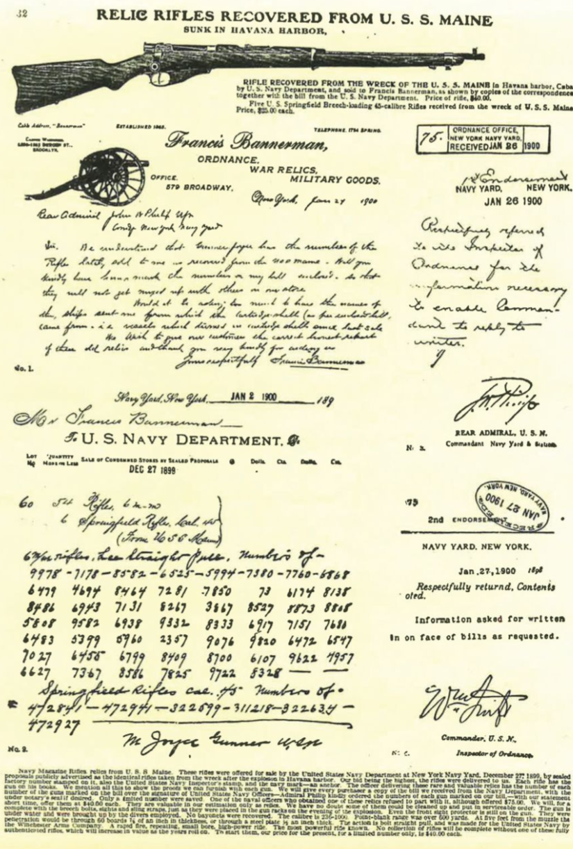 Years after the USS Maine disaster, the Bannerman company recovered 40 Winchester M1895 Lee-Navy and 6 Springfield Armory M1885 Trapdoor rifles from the wreckage. The 6 Trapdoors belonged to the ship’s Marine detachment, and as of now are the only USMC provenance Trapdoor rifles that can be verified through any type of documentation (Anderson collection).