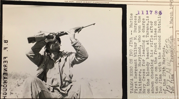 S.F. Co. magazine pouch on First Sergeant Wilber Burgess’s M1 Carbine on Iwo Jima (NARA).