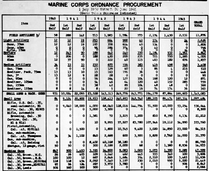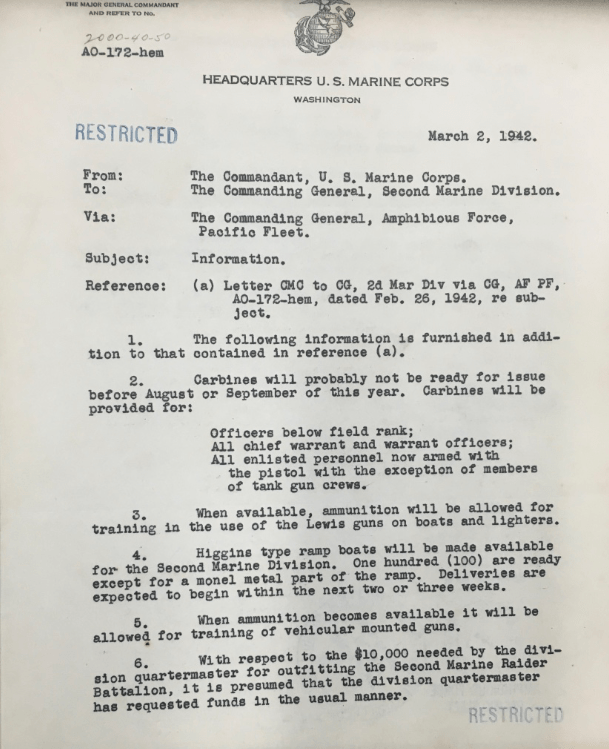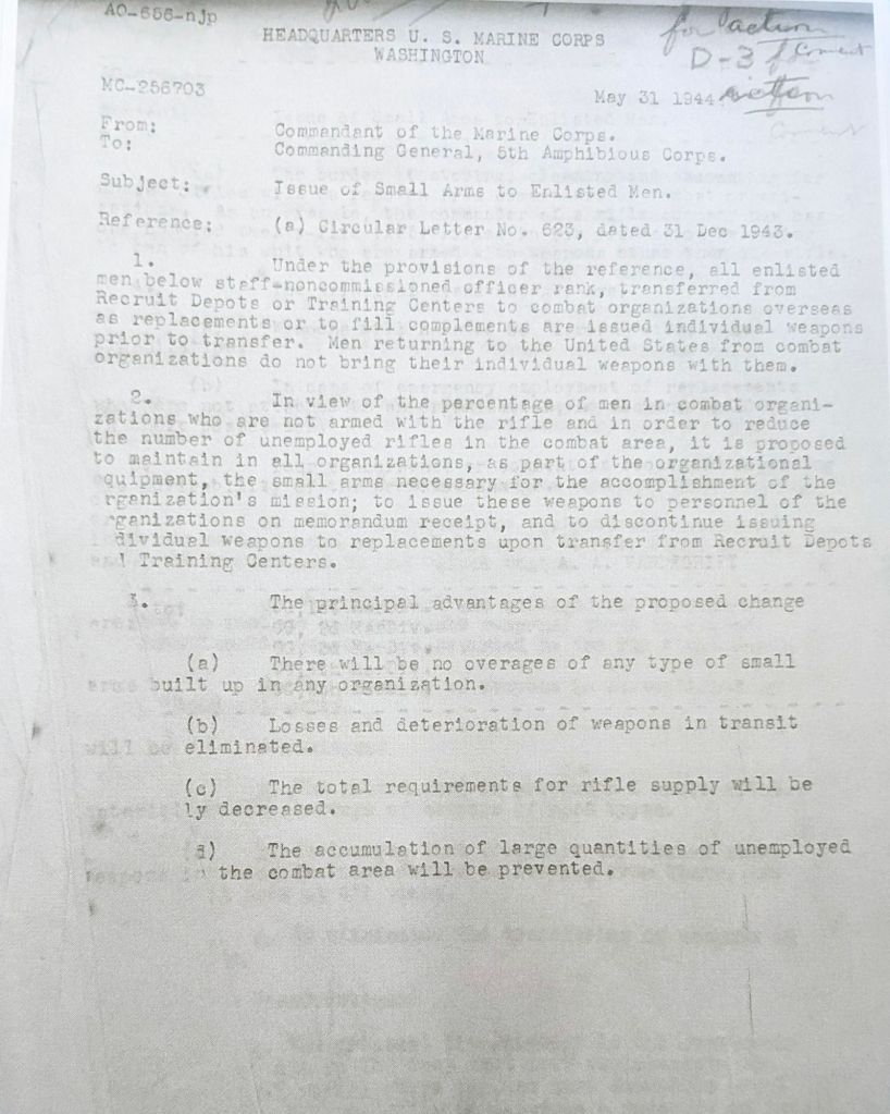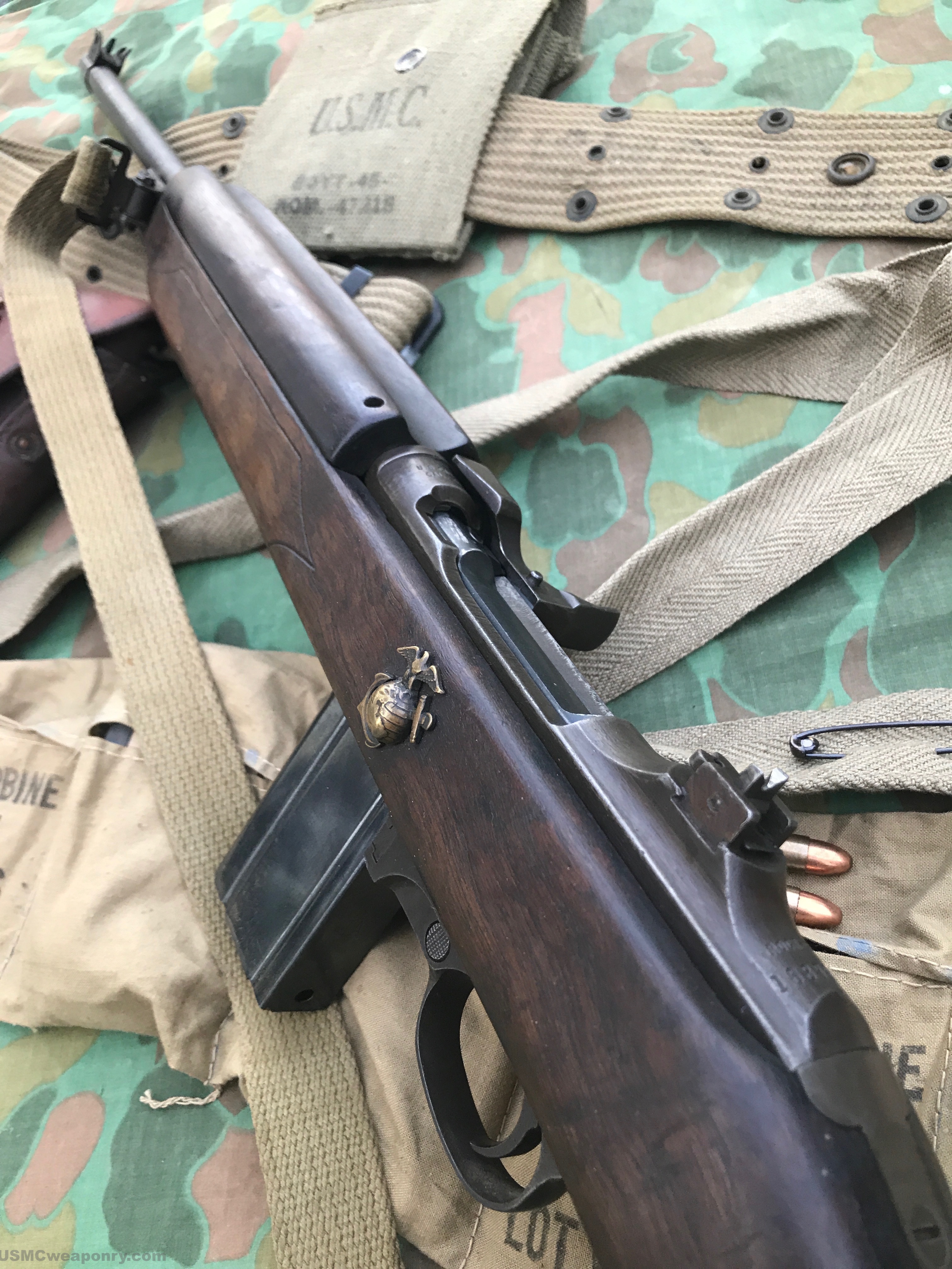 Once the Marine Corps began receiving M1 Carbines in late 1942, they were distributed by priority number. Rapid mobilization of private industry allowed the M1 Carbine to be produced in large numbers expediently, with the USMC being fully outfit with the new weapon by mid 1943 (NARA).
