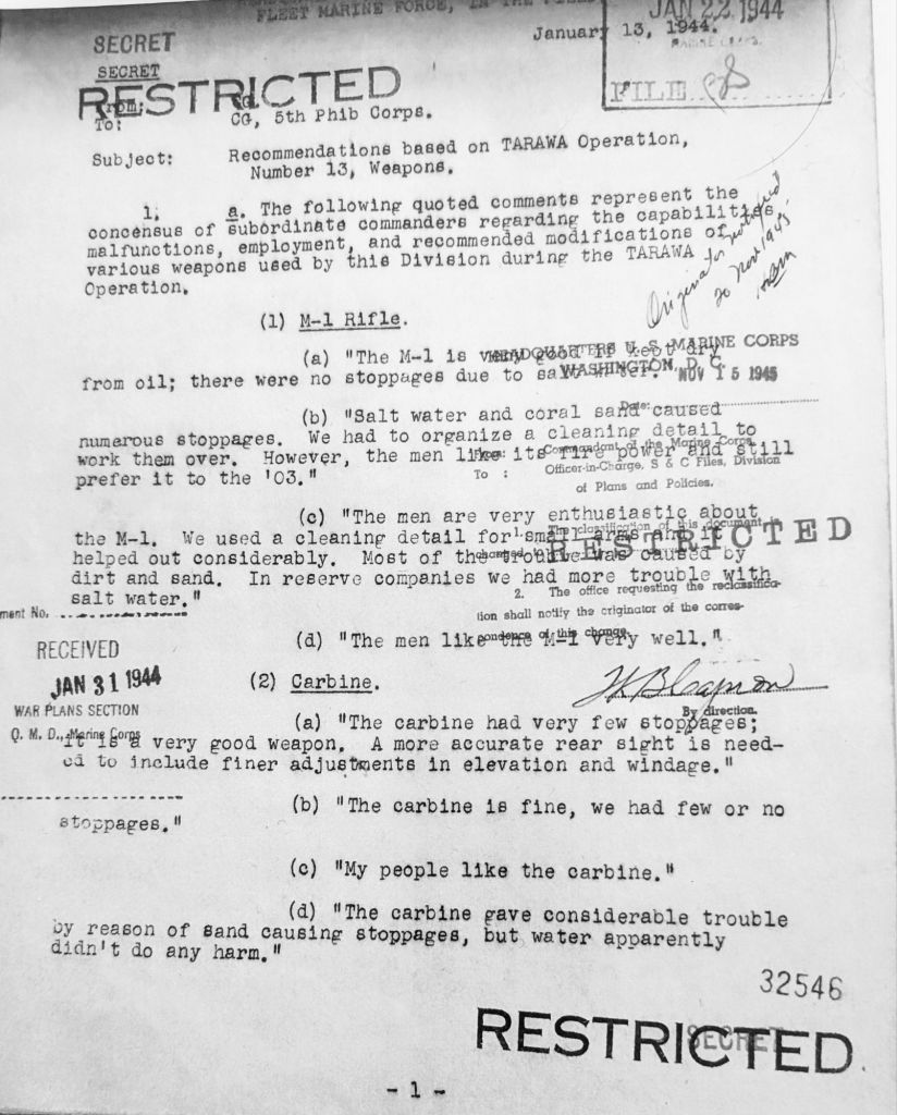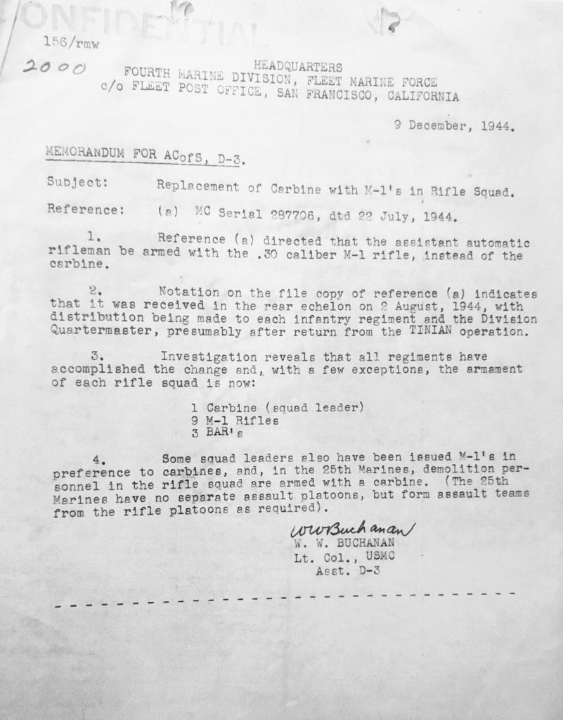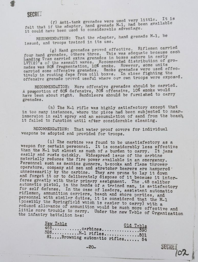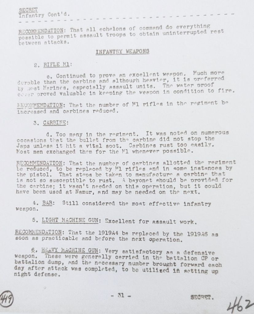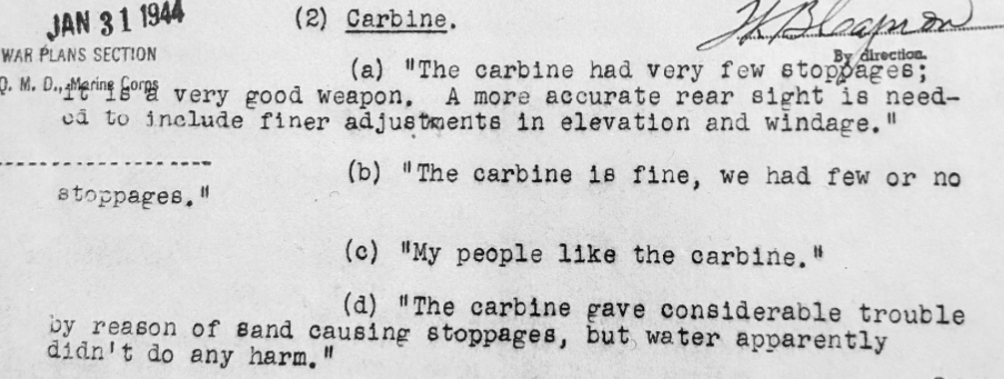 Following the Saipan Campaign, the 4th Marine Division found the M1 Carbine to have performed poorly and recommended a reduction in the amount issued in exchange for M1 Garands (NARA).