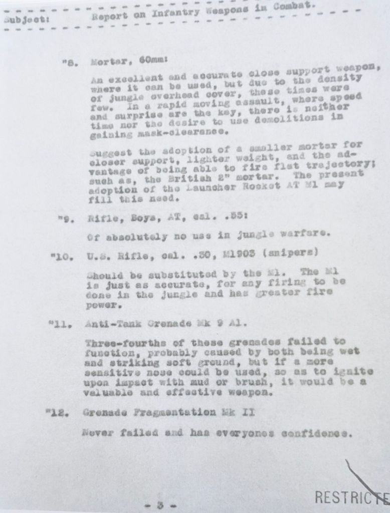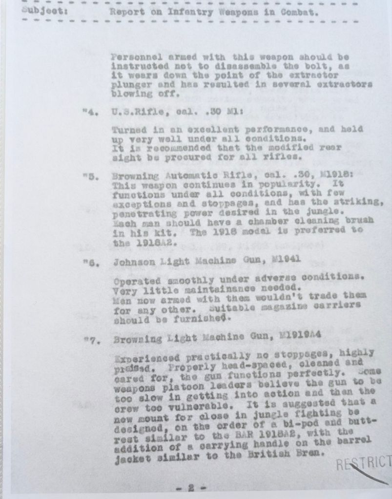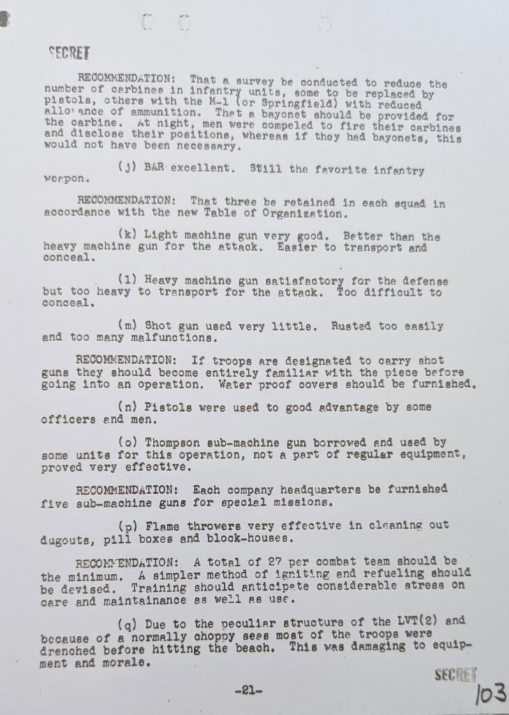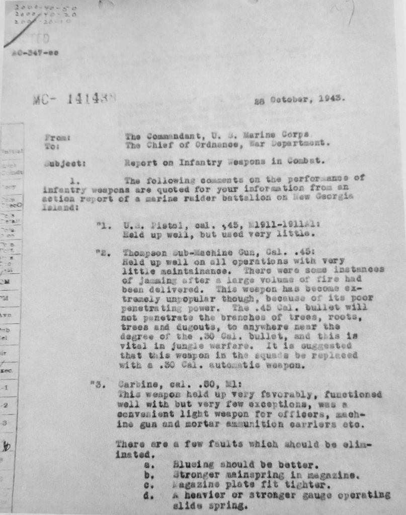 Following the Saipan Campaign, the 4th Marine Division found the M1 Carbine to have performed poorly and recommended a reduction in the amount issued in exchange for M1 Garands (NARA).