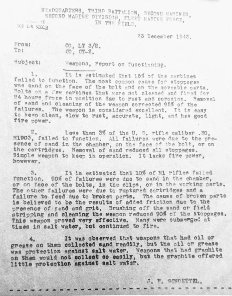 After action reports from different battalions in the 2nd Marine Division detailing weapons performance at Tarawa (NARA).