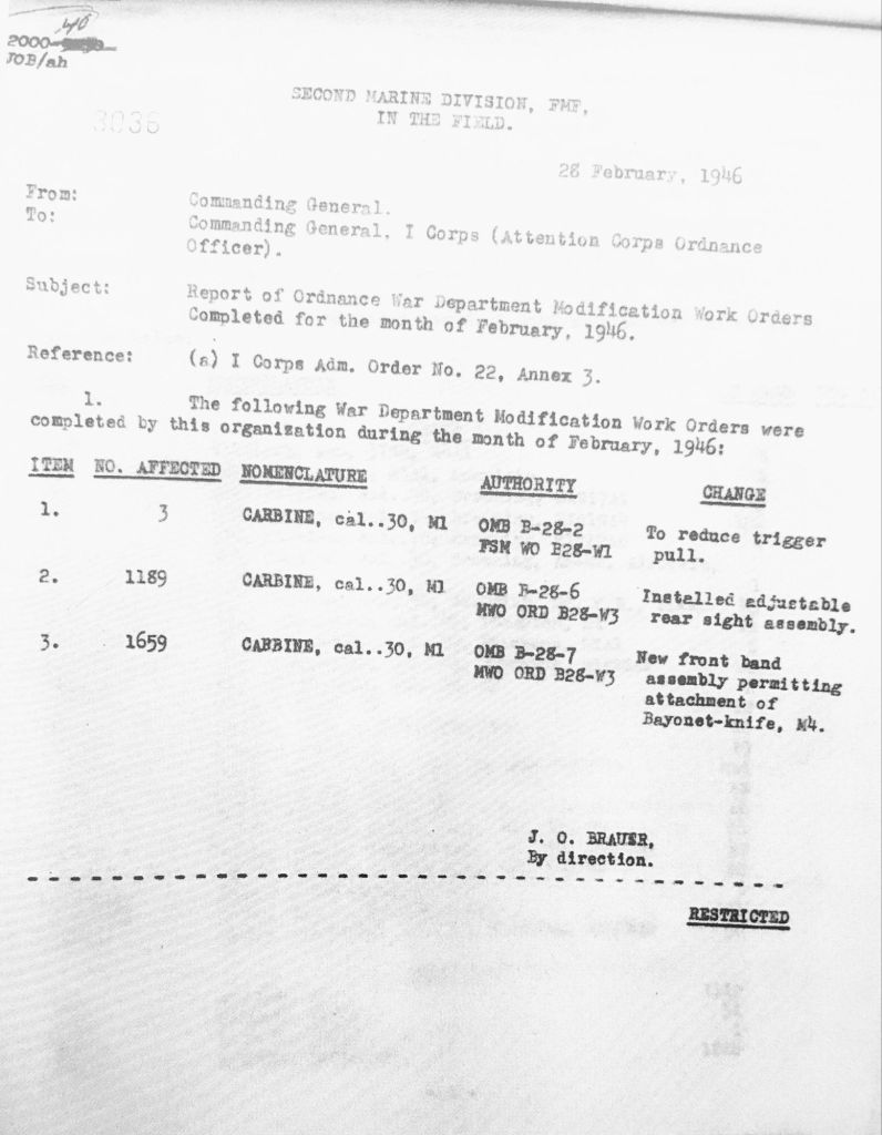 In 1944, the Ordnance Department would mandate an adjustable rear sight for the M1 Carbine, as well as a stronger upper band with more stock contact. The upper band would be improved further with the inclusion of a bayonet lug for the M4 Bayonet, and an improved switch style safety would help the operator differentiate from the magazine release.While there are photographs of these improvements on M1 Carbines in the European Theater, none so far have surfaced in the hands of Marines. Work order documents from the 2nd Marine Division show these updates having been completed by early 1946, after the war had ended.