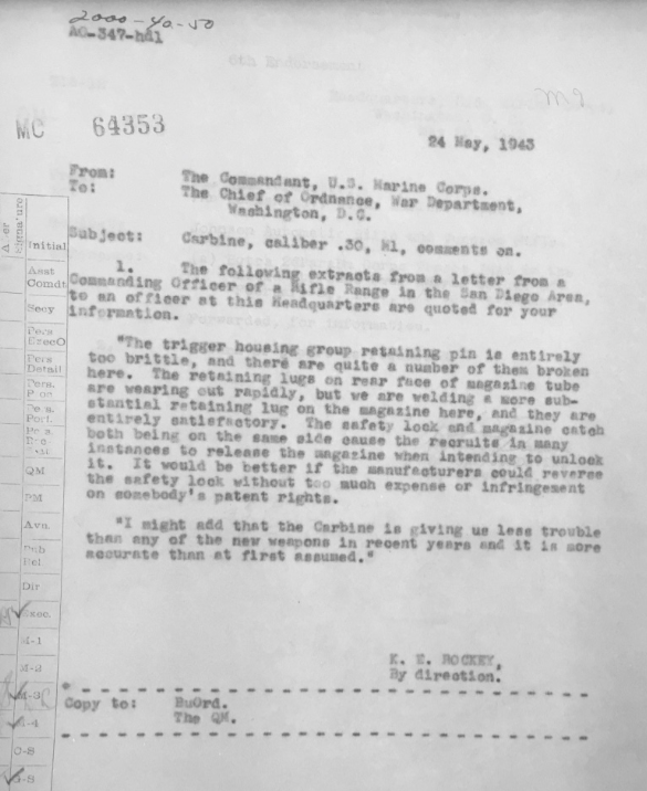 Documents detalailing M1 Carbine procurement by the Marine Corps in early 1943 (NARA).