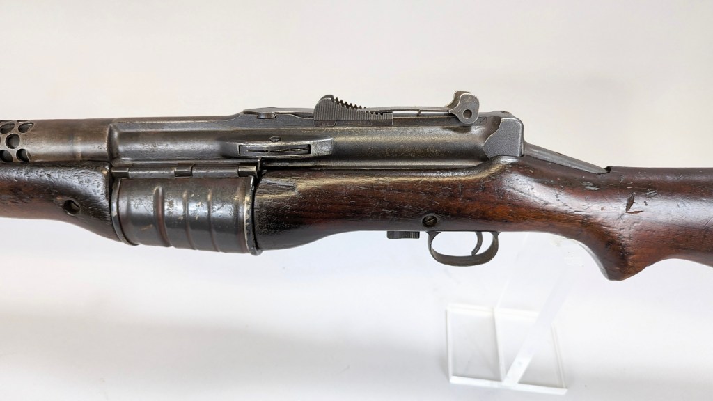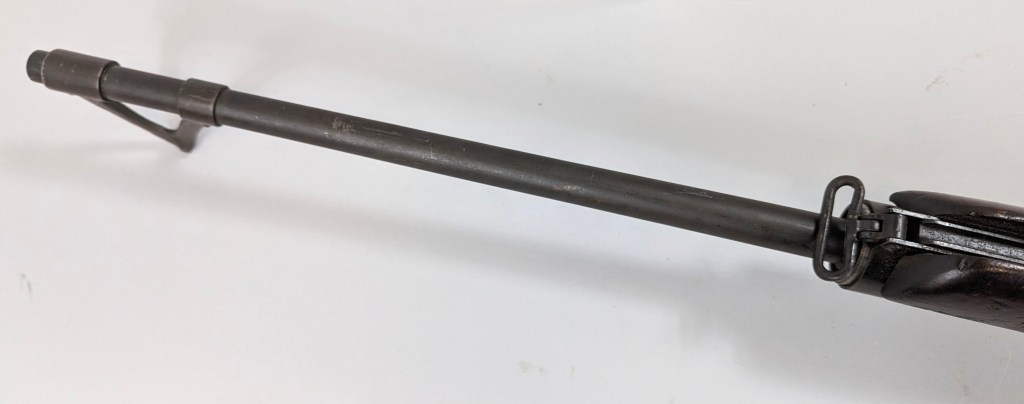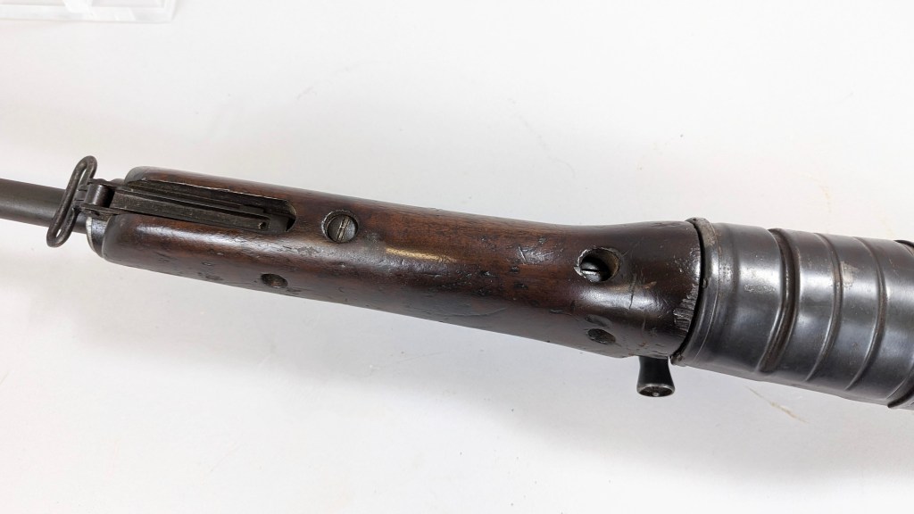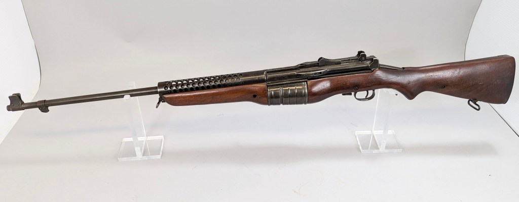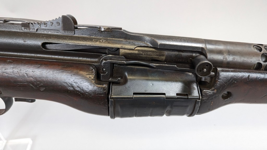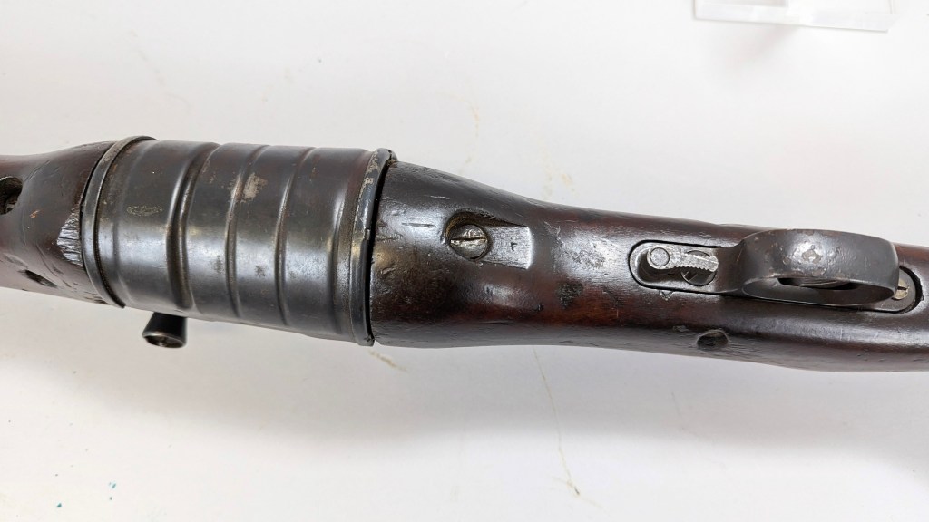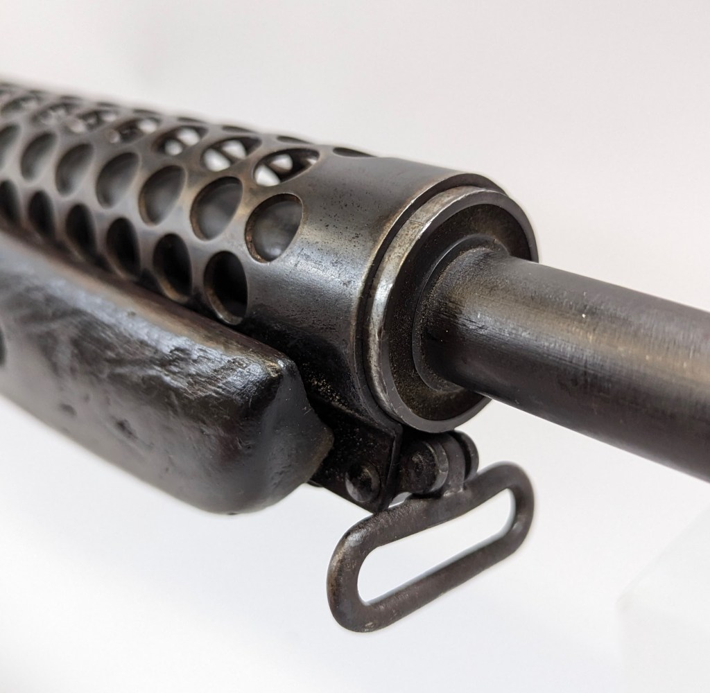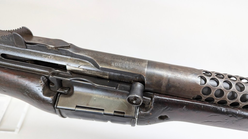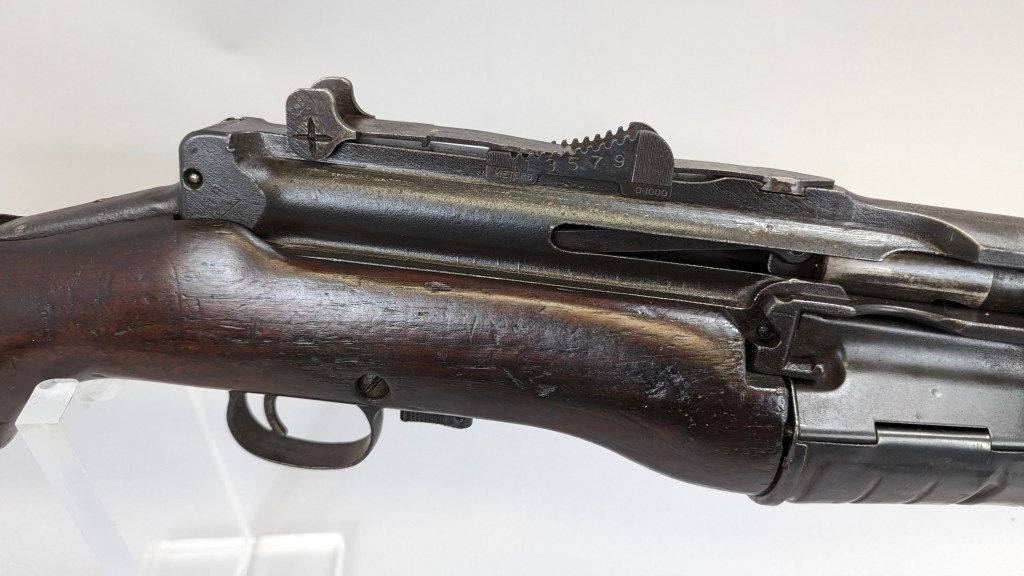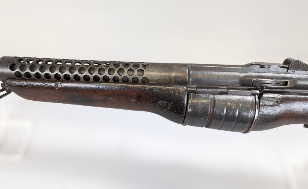 M1941 Johnson rifles can only be identified as Marine Corps in provenance with absolute certainty through documentation, but there do seem to be some modifications associated with the USMC. Marine M1941s are often noticed with front sight ears being removed, and the rear peep sight opened up by a “v” cut. Other modifications have been noticed as well, including charging handles made to resemble those on the M1 Garand. The Marine Corps History Division maintains a handful of M1941s, including two of the original 23 that were used by the 1st Parachute Battalion on Guadalcanal. Most of the others have modifications of some sorts, primarily to the sights. One interesting example has a Johnson Light Machine Gun barrel installed, while another has a barrel that was shortened.