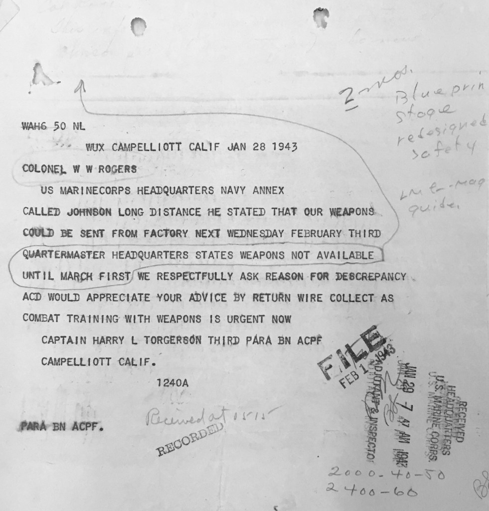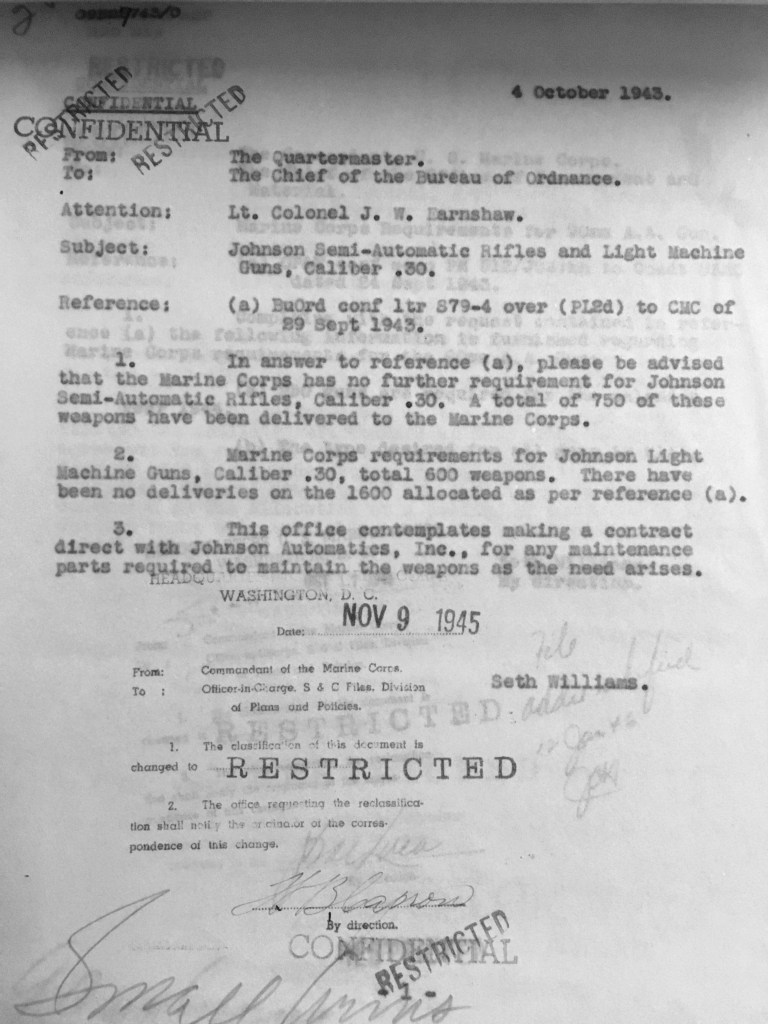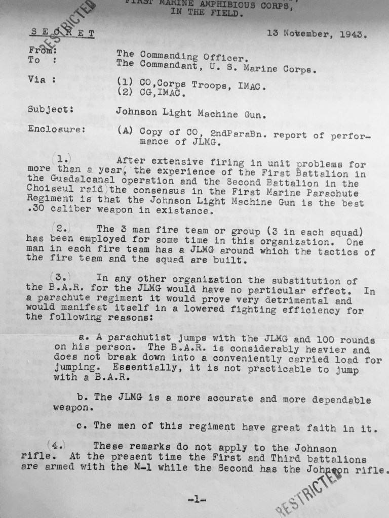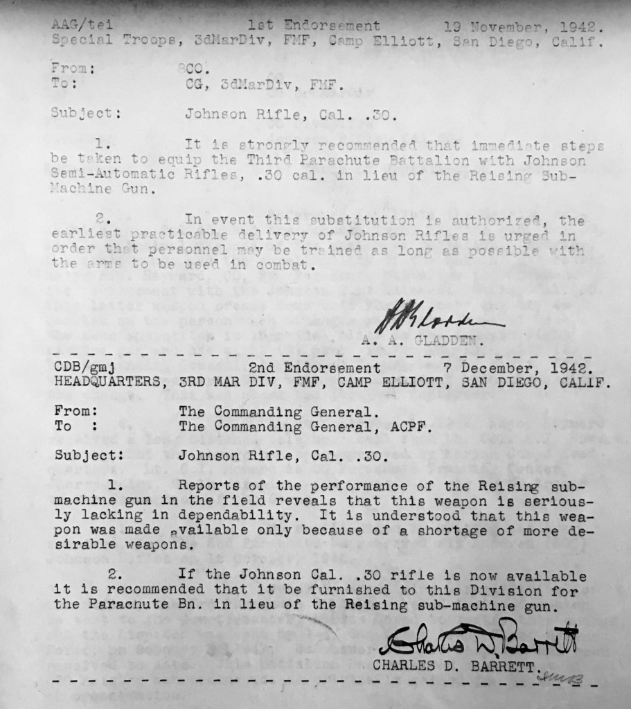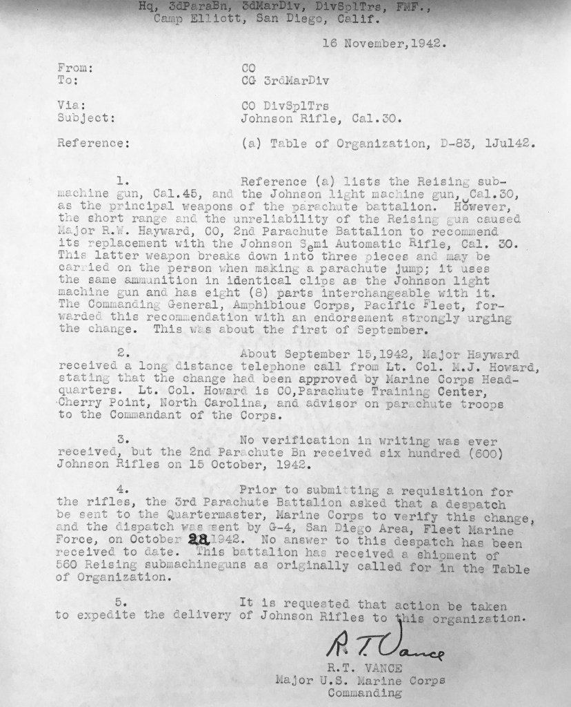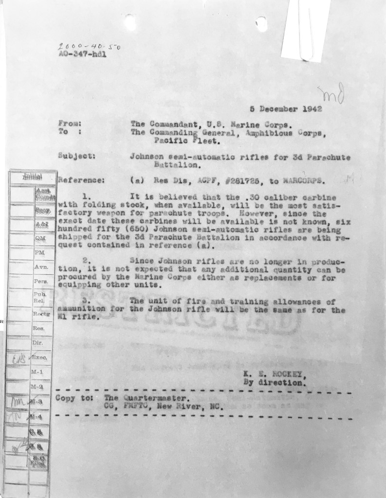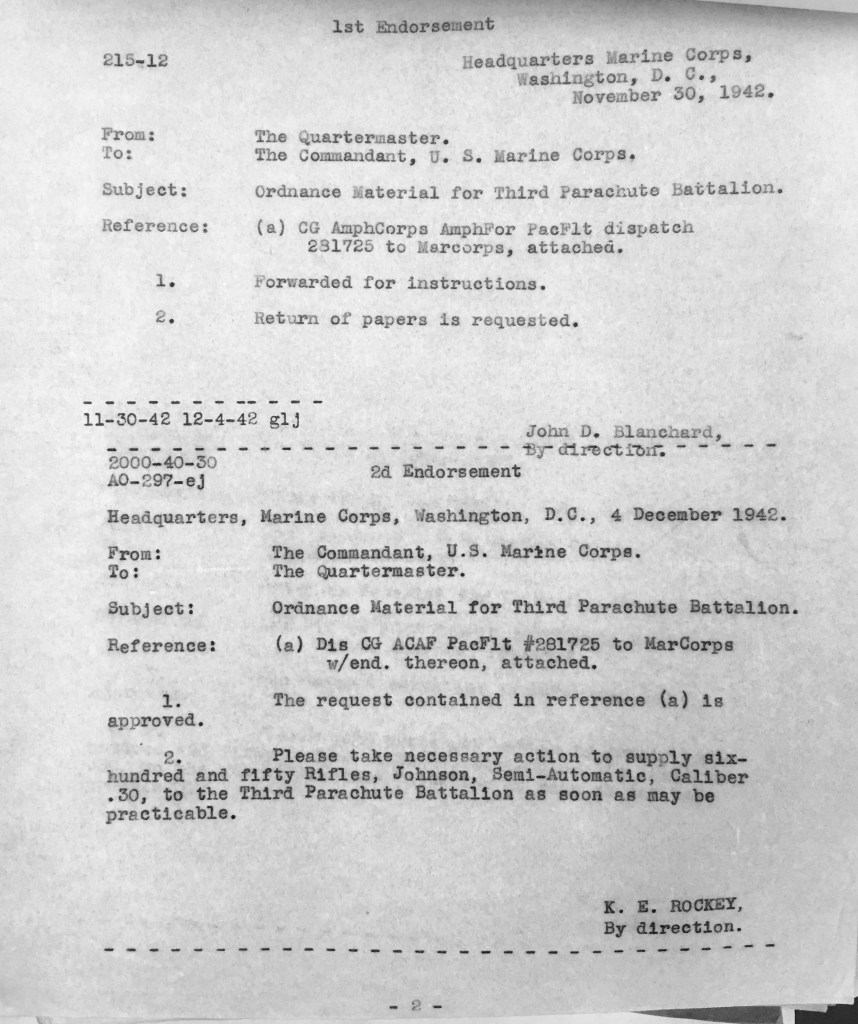 Documents detailing the 2nd Marine Division’s acquisition of 650 M1941 Johnson Rifles for the 2nd Parachute Battalion in 1942 (NARA).