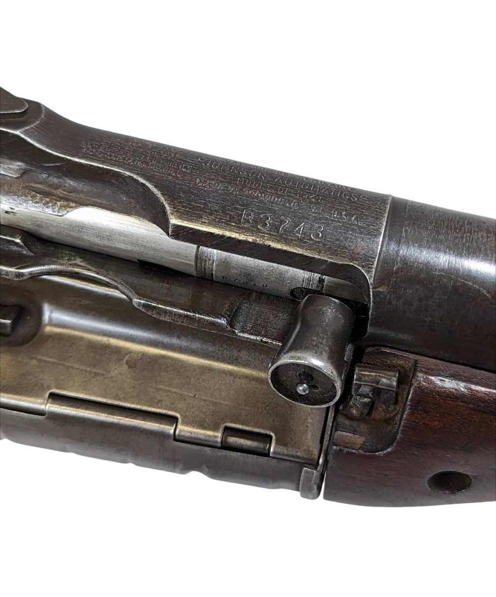 USMC M1941 Johnson Rifle #B3743, this rifle has had the protective front sight ears removed – the most common M1941 modification associated with the Marine Corps (USMC).