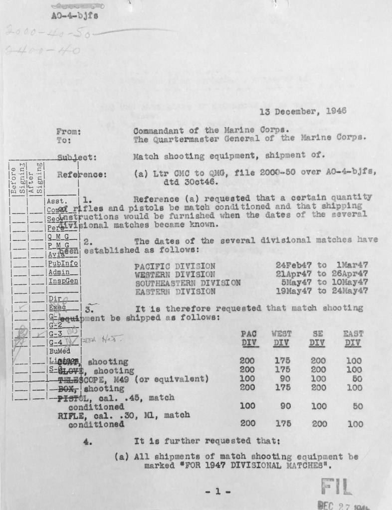 Request for match-conditioned M1 Garands to be assembled and dispersed for Division matches following World War II (NARA).