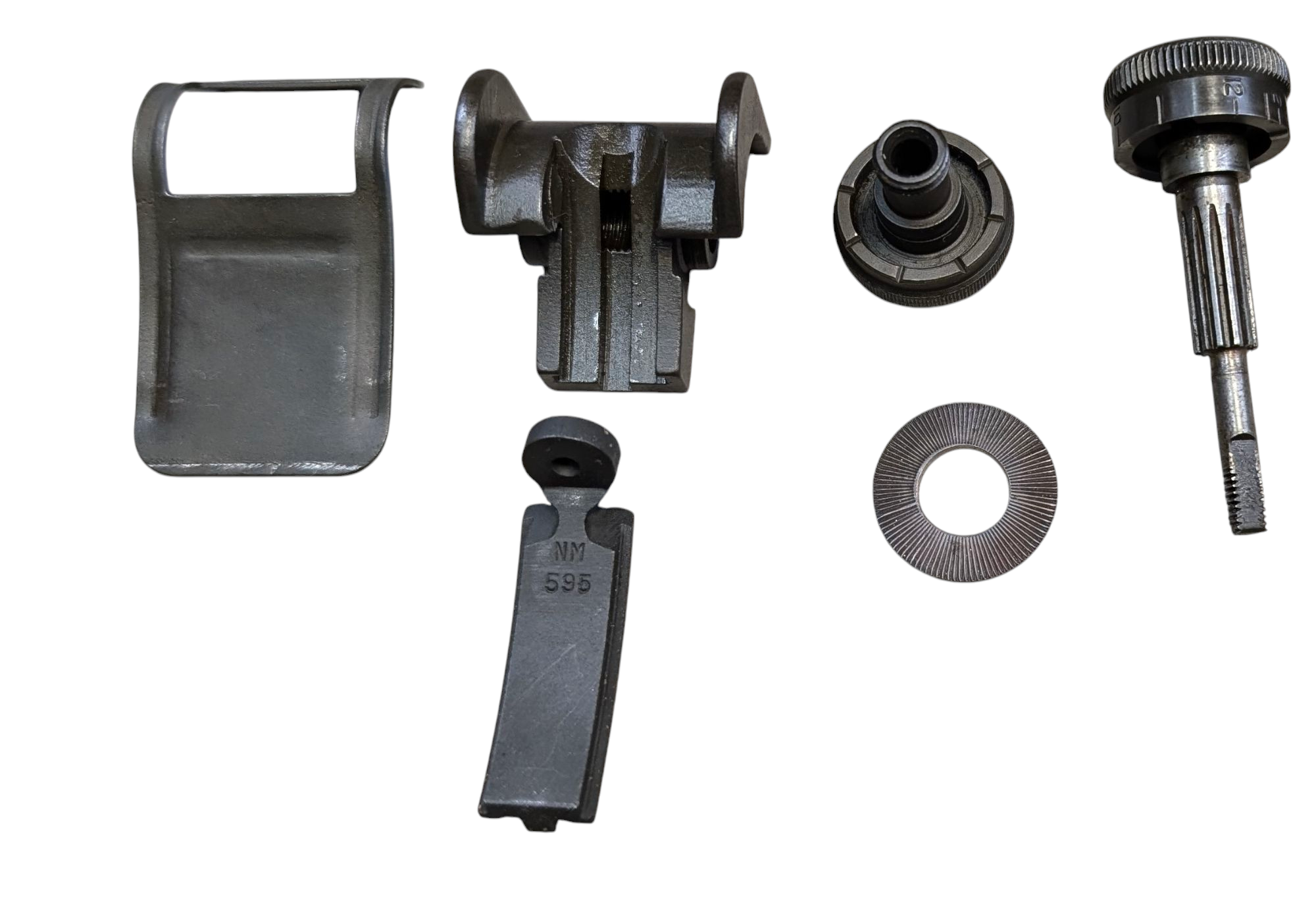 USMC spec NM rear sight parts, notably the eight-notched ½ MOA windage knob and the ½ MOA elevation disc which is attached by epoxy or heated resin.