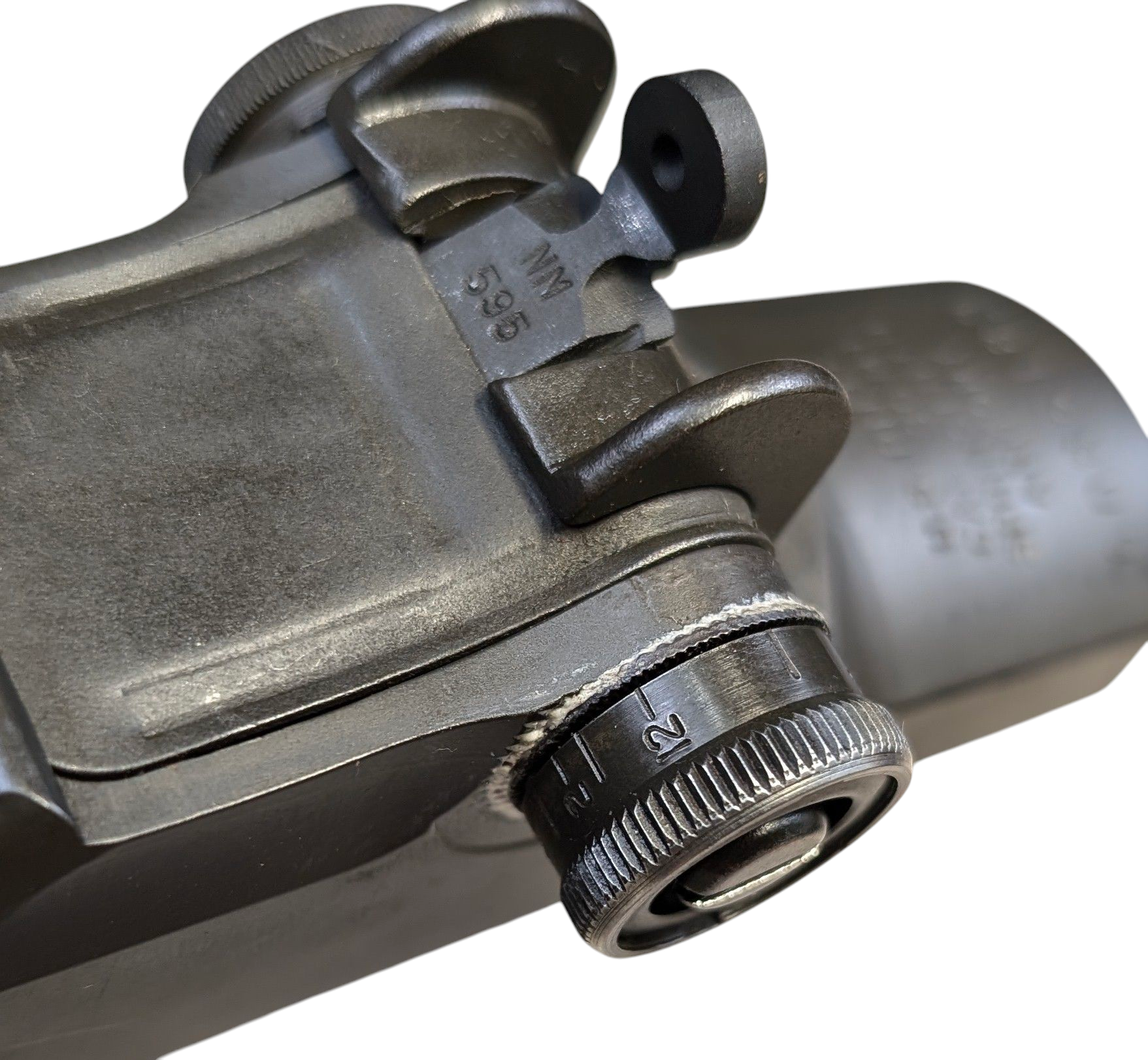 The 1/2-minute windage conversion process began with a 1/8” hole being drilled 1/4″ deep at the 6 o’clock position in the receiver’s 1-minute rear sight notches. A 1/8” ball bearing and 1/4” spring were inserted into the drilled hole, and an original, modified 8-cut windage knob installed. While standard windage knobs have four flats that match the factory 1-minute rear sight notches, the modified elevation knob has eight small notches that catch the ball bearing every “click”, creating 1/2 -minute windage. Adjustments with the ball bearing are crisp and seamless, giving the best feel for the shooter. For a long time, this system was considered the hallmark of Air Force Premium Grade (AFPG) M1 Garands, but the reality is the Air Force adopted this practice from the Marine Corps. The Air Force would use M1 Garands on their rifle team after the Marine Corps had transitioned to the NM M14, and would combine the USMC’s 1/2-minute windage design with Springfield Armory’s 1/2-minute elevation system. In this regard, AFPG M1s combined the best parts of USMC and army match-conditioned M1s creating an exceptional product.