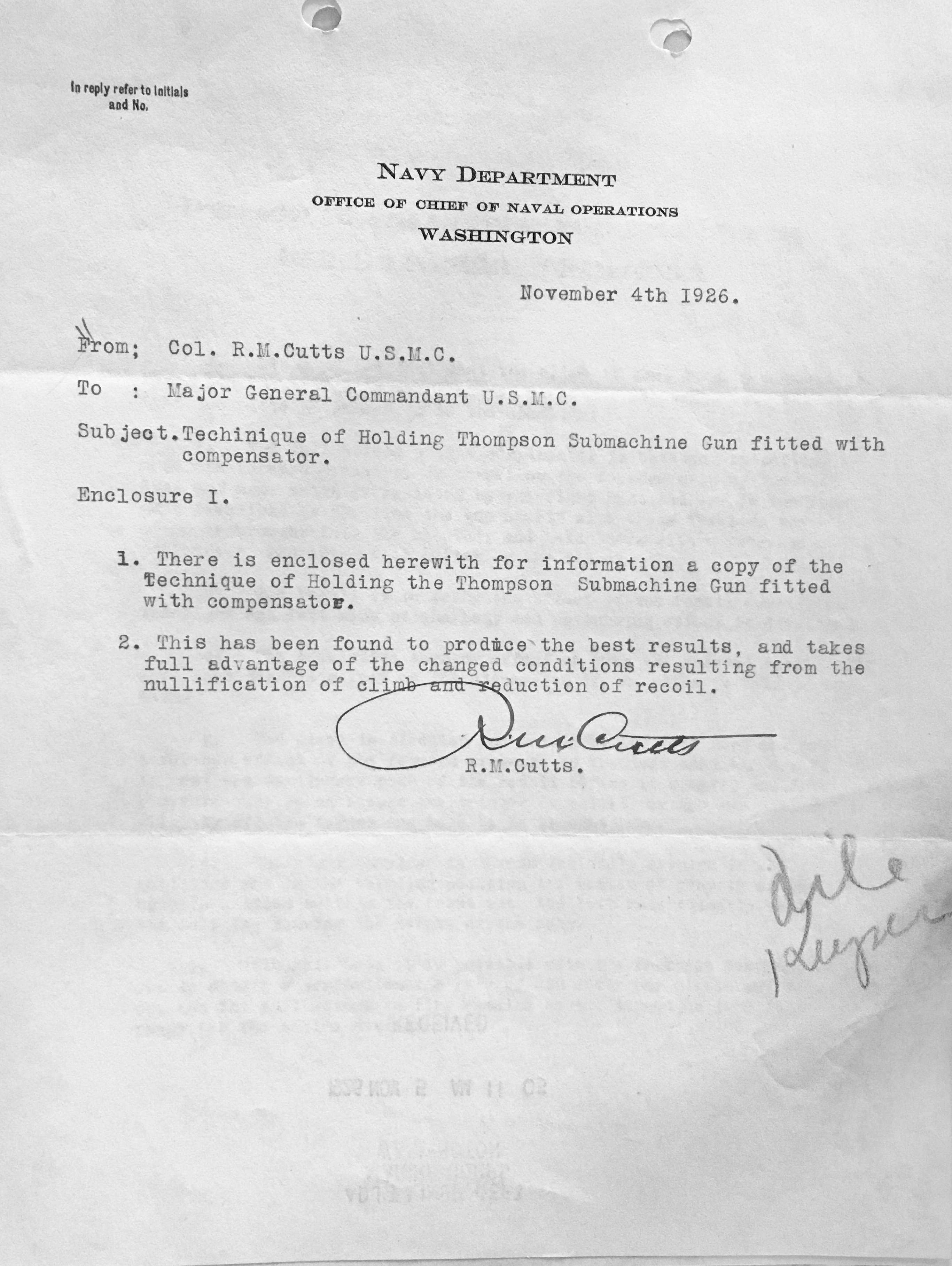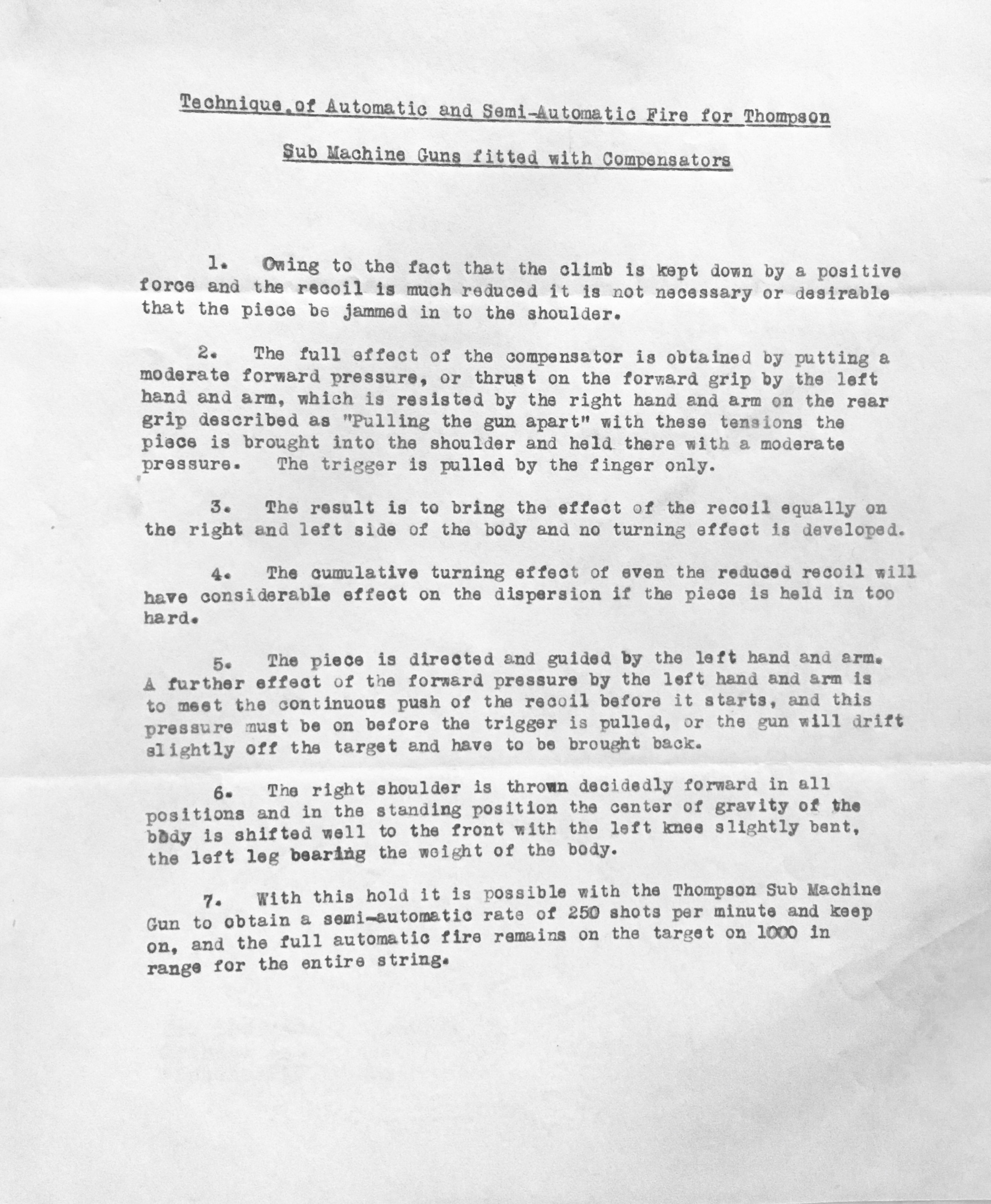 Instructions from Colonel Cutts on the proper employment of the TSMG with his compensator (NARA).