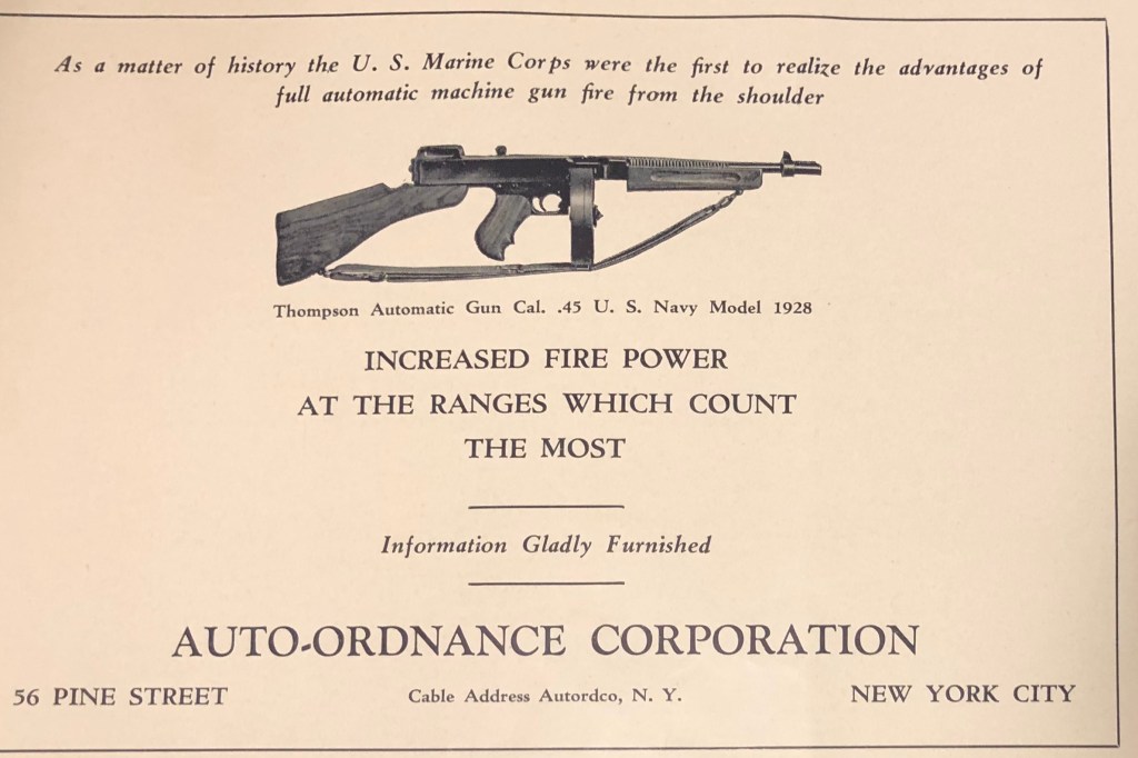 The Thompson Sub Machine Gun (TSMG) would begin its association with the Marine Corps during a demonstration in 1920. Impressed by the Thompson’s capability, Colonel Cyrus S. Radford would privately purchase three TSMGs for the Marine Corps to test in the fall of 1921. Several small orders of Model 1921A Thompsons would be placed in 1923 & 1925, for testing and service in Haiti with the 2nd Marine Regiment. Large scale service would not begin until the fall of 1926 when it was decided that the standard Model 1921A was to be modified to better fit military needs. Marine Colonel Robert Cutts’ recoil reducing compensator was to be attached to the barrel, creating a variant known as the Model 1921 AC.