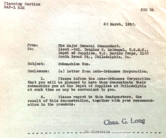 Marine Corps Gazette article from the Winter of 1926 mentioning the adoption of the TSMG (NARA).