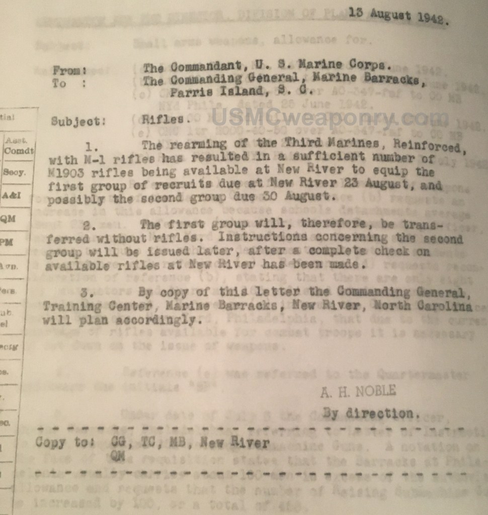 Order from the Commandant of the Marine Corps officially adopting the M1 Garand as the standard service rifle for all units on June 26, 1942 (NARA).