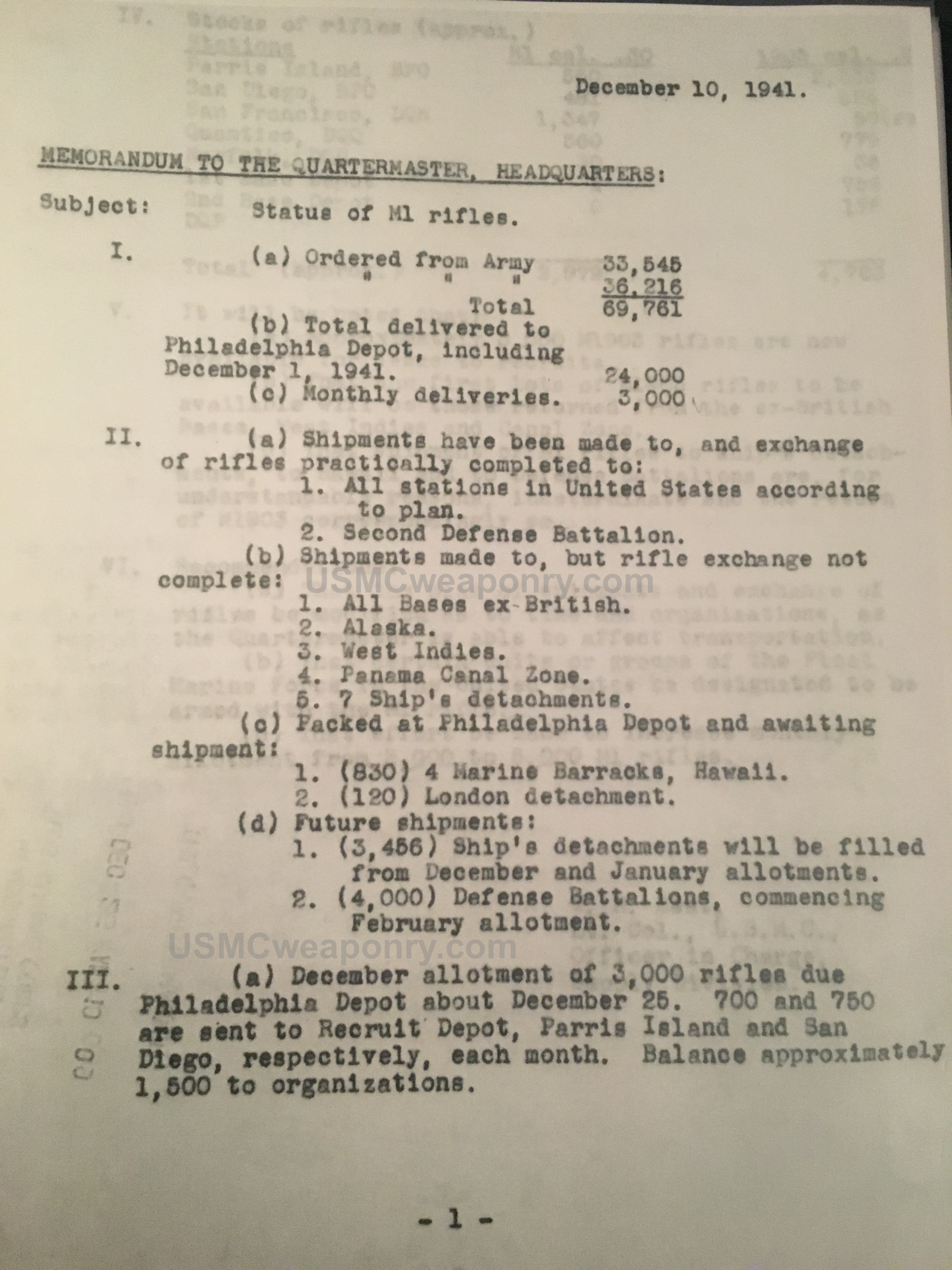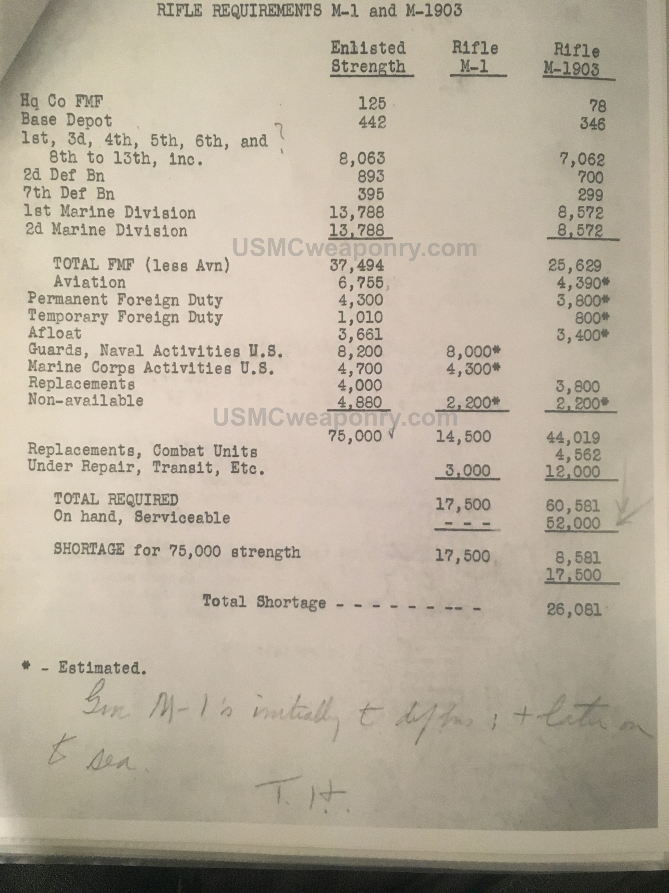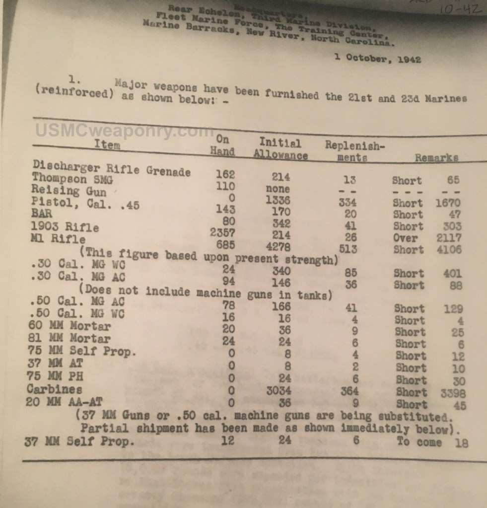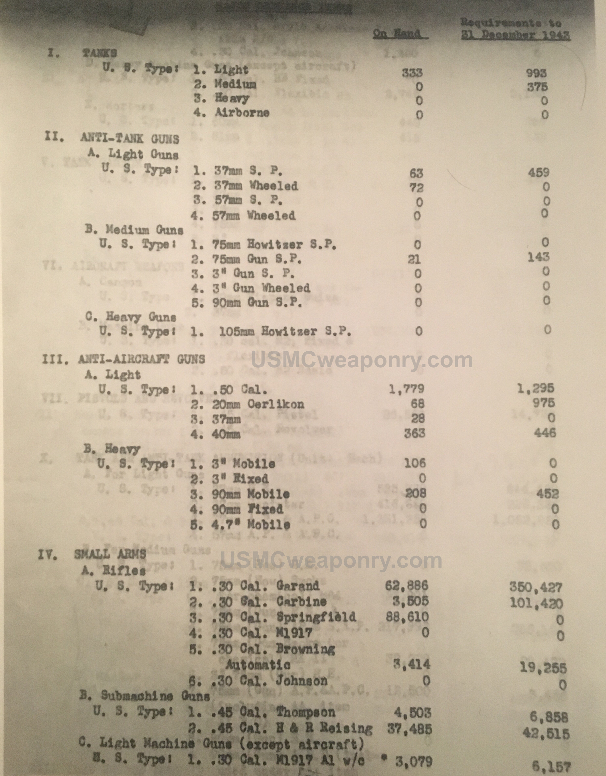 Weapons counts from Guadalcanal, showing the distribution of M1 Garands amongst units. The last document details the total amount of M1 Garands in USMC possession by the end of fiscal year 1942 as being 62,886. The ordnance department would allocate the Marines 22,000 M1s per month for the first three months of 1943, with a disproportionate amount falling in the Springfield Armory 1.14 million serial number range (NARA).