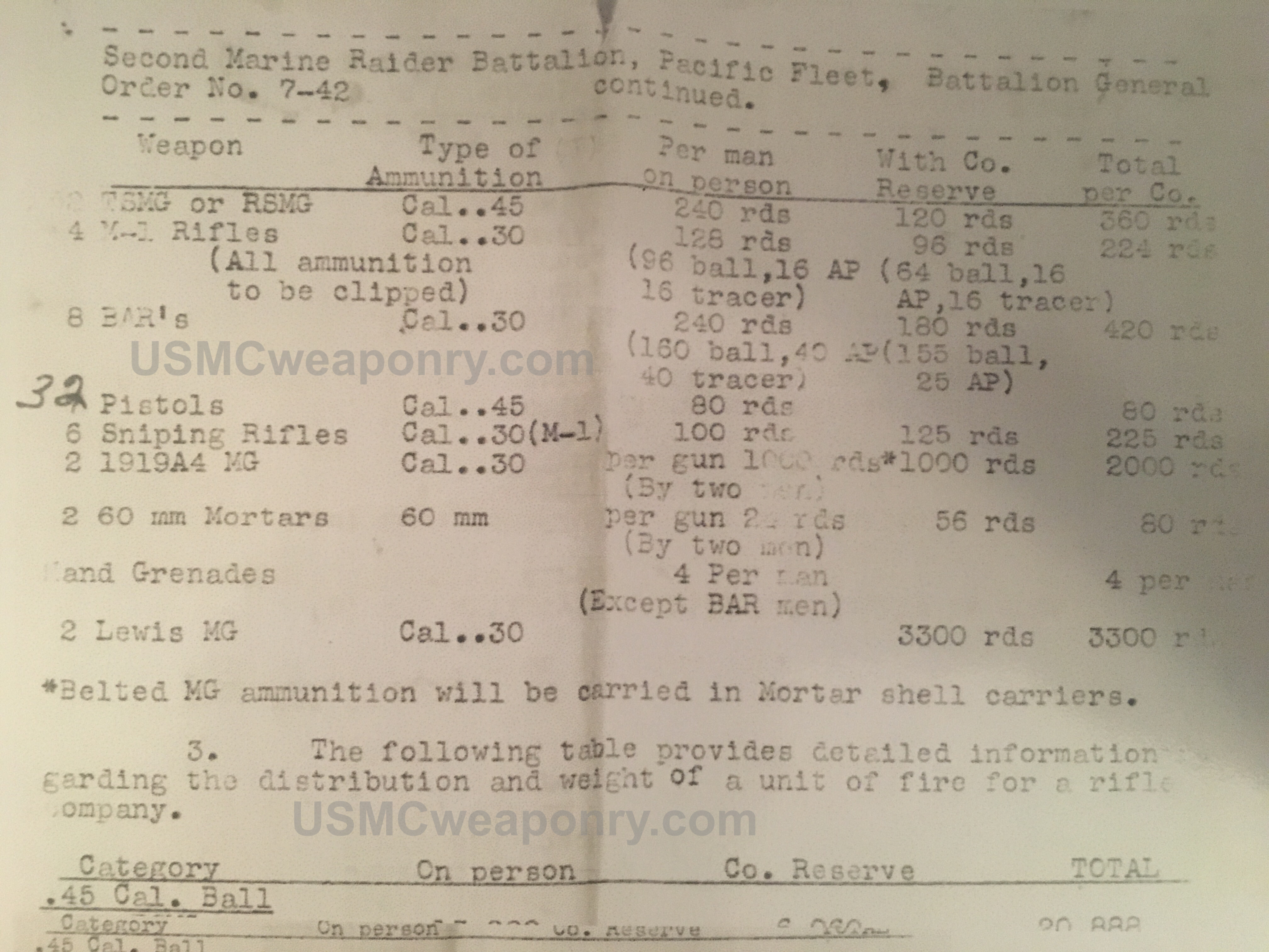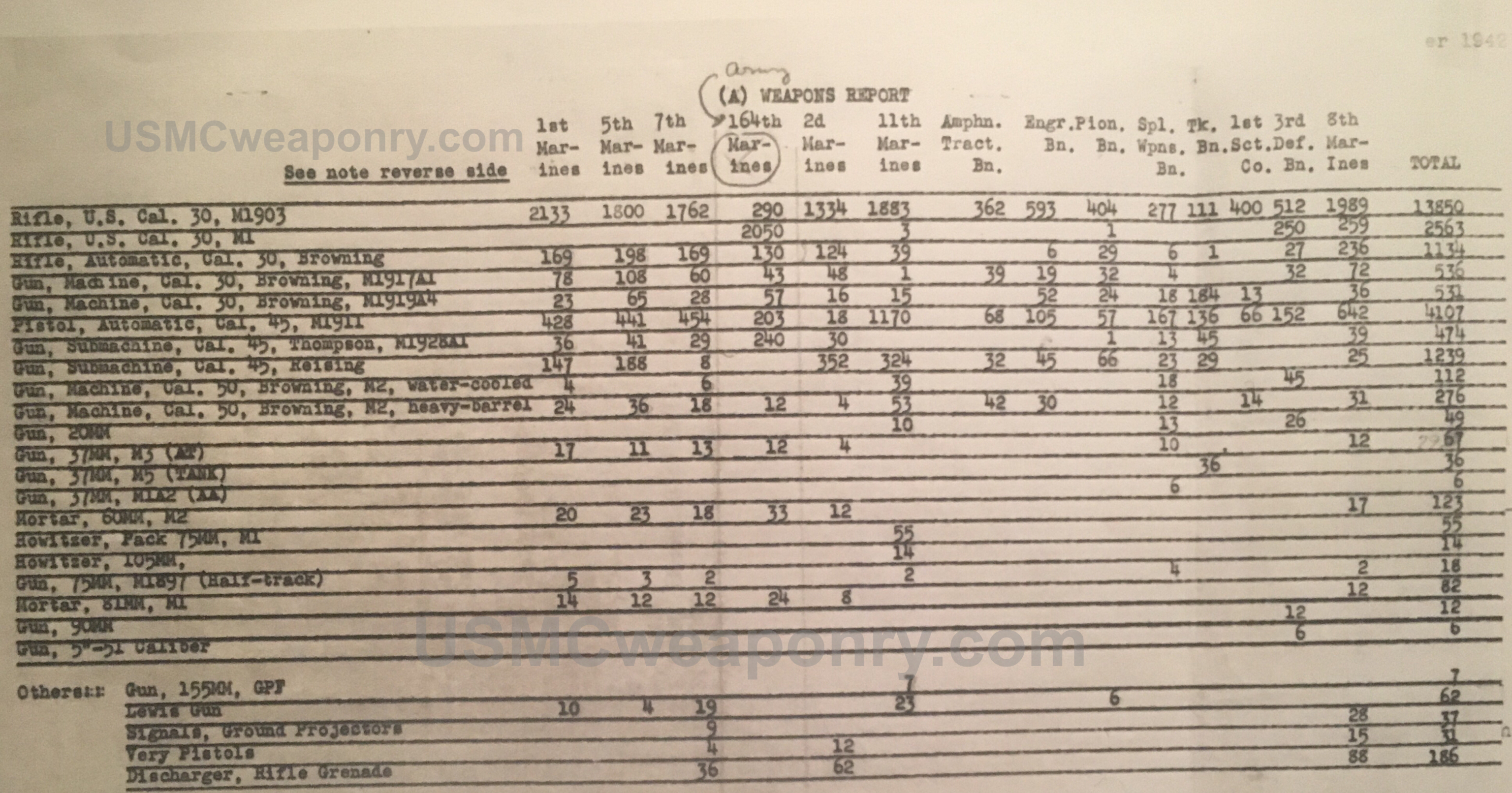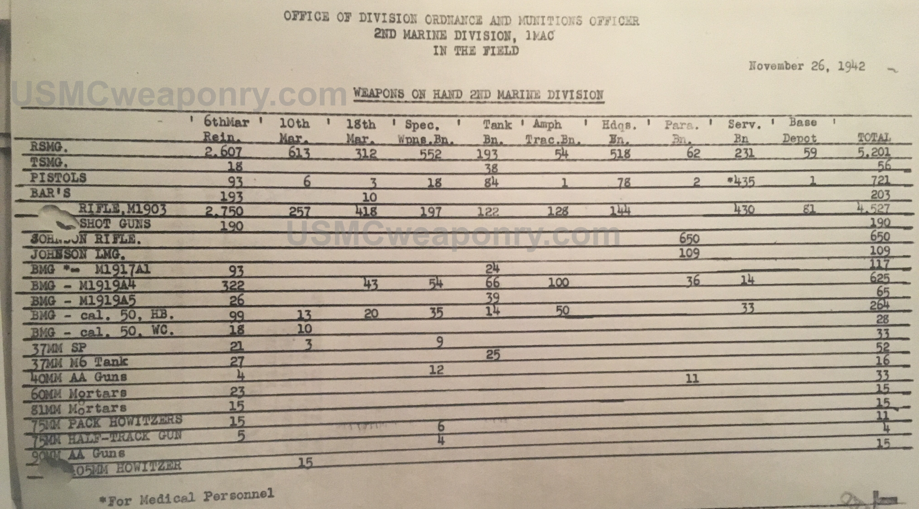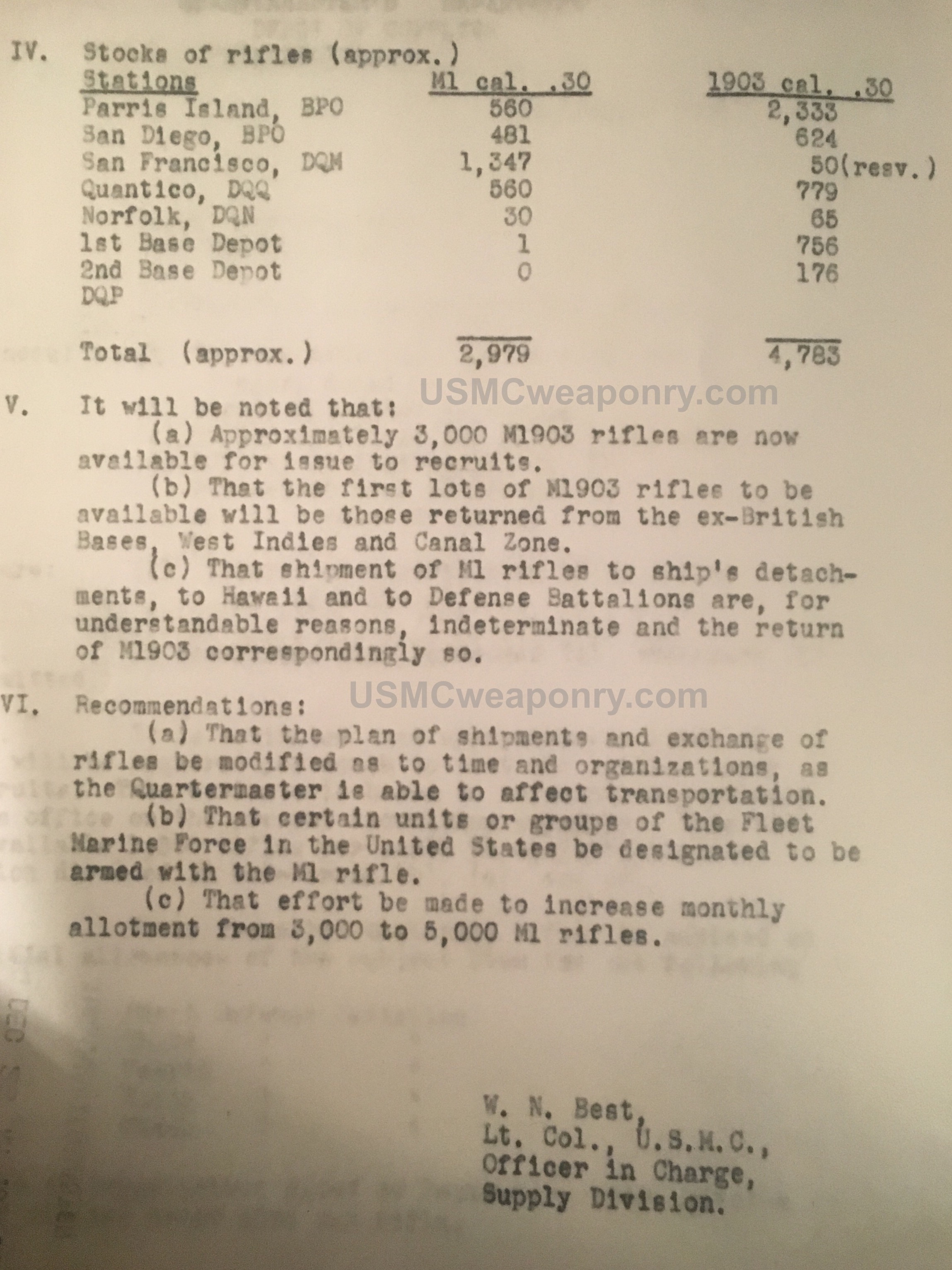 Weapons counts from Guadalcanal, showing the distribution of M1 Garands amongst units. The last document details the total amount of M1 Garands in USMC possession by the end of fiscal year 1942 as being 62,886. The ordnance department would allocate the Marines 22,000 M1s per month for the first three months of 1943, with a disproportionate amount falling in the Springfield Armory 1.14 million serial number range (NARA).