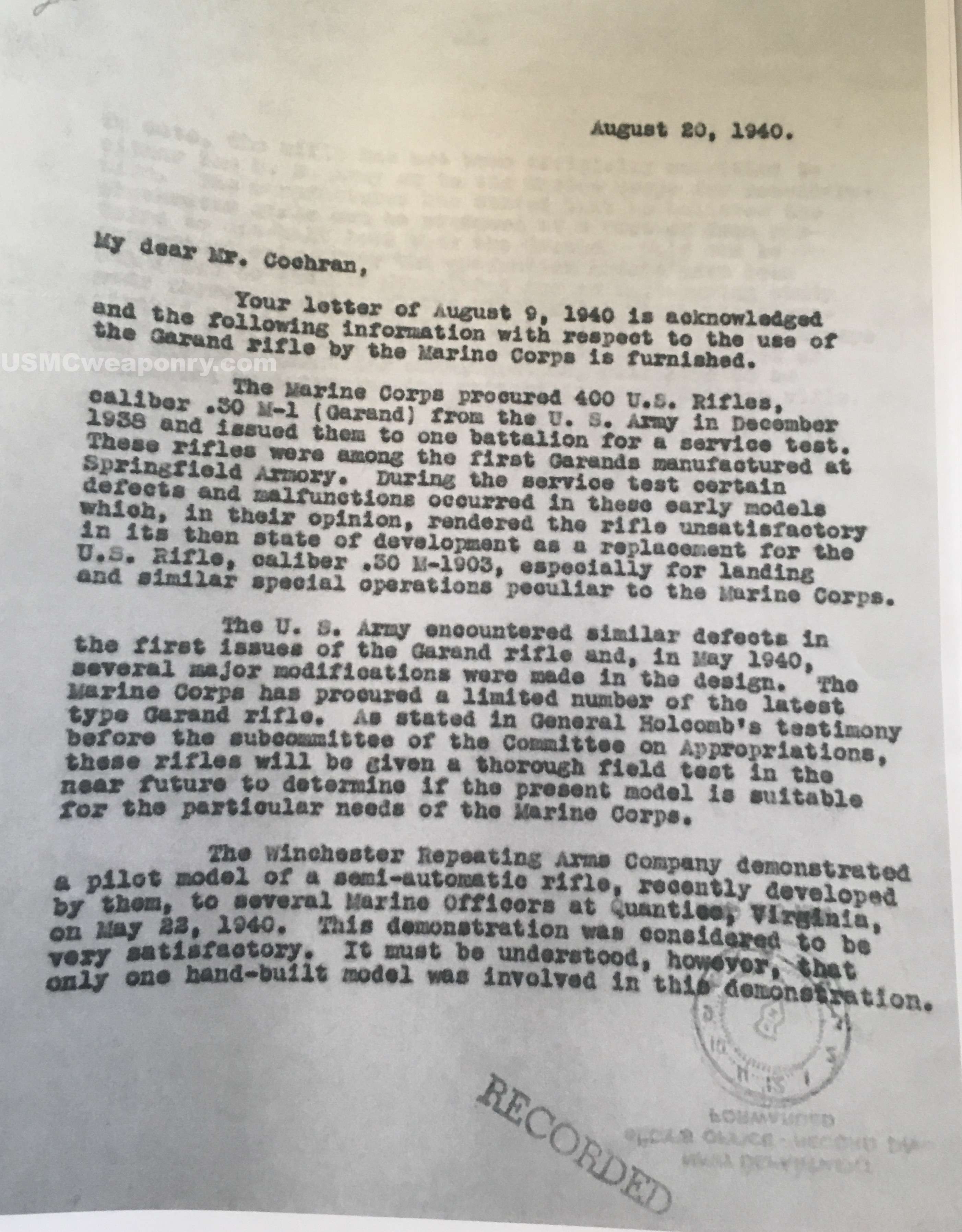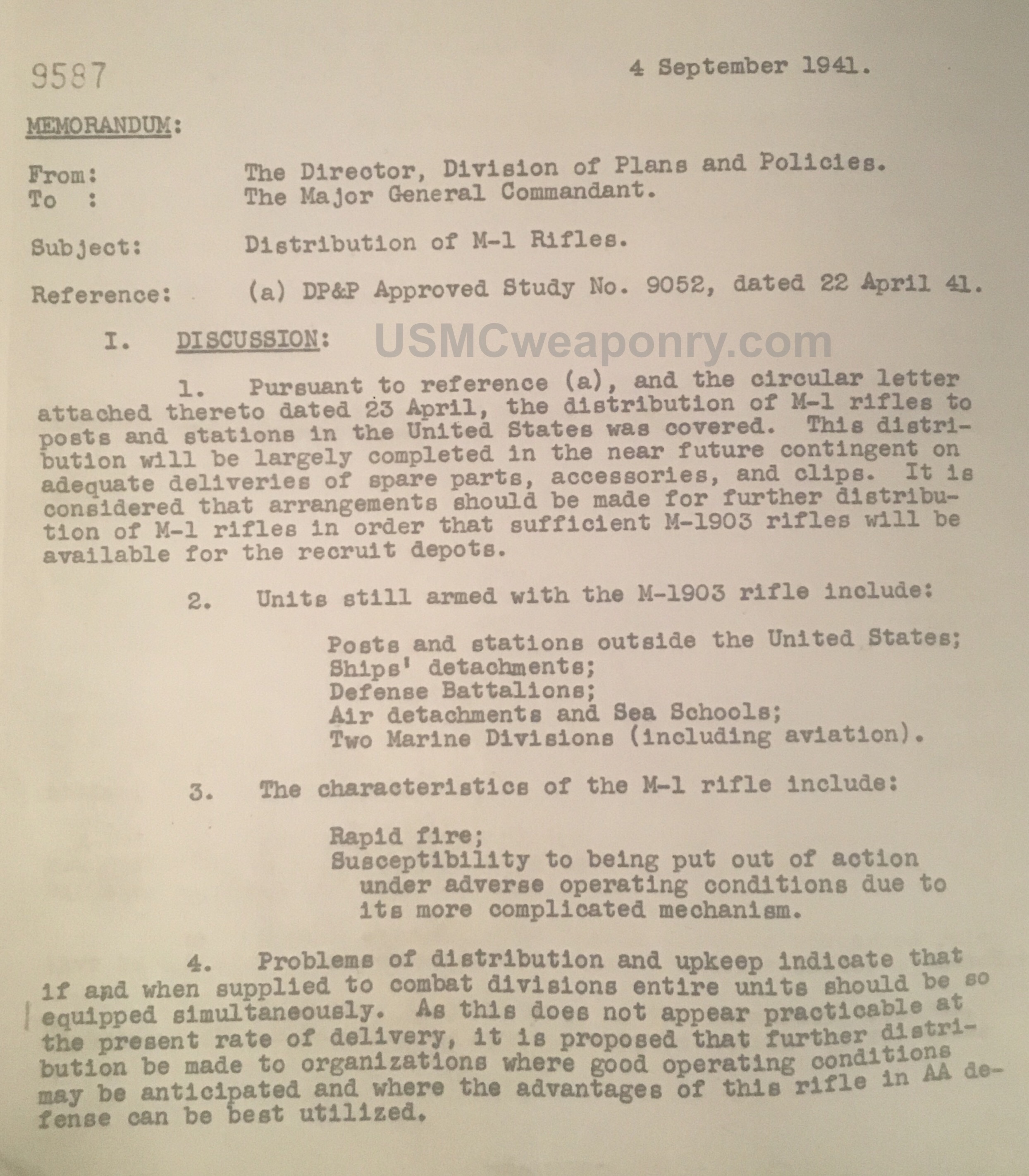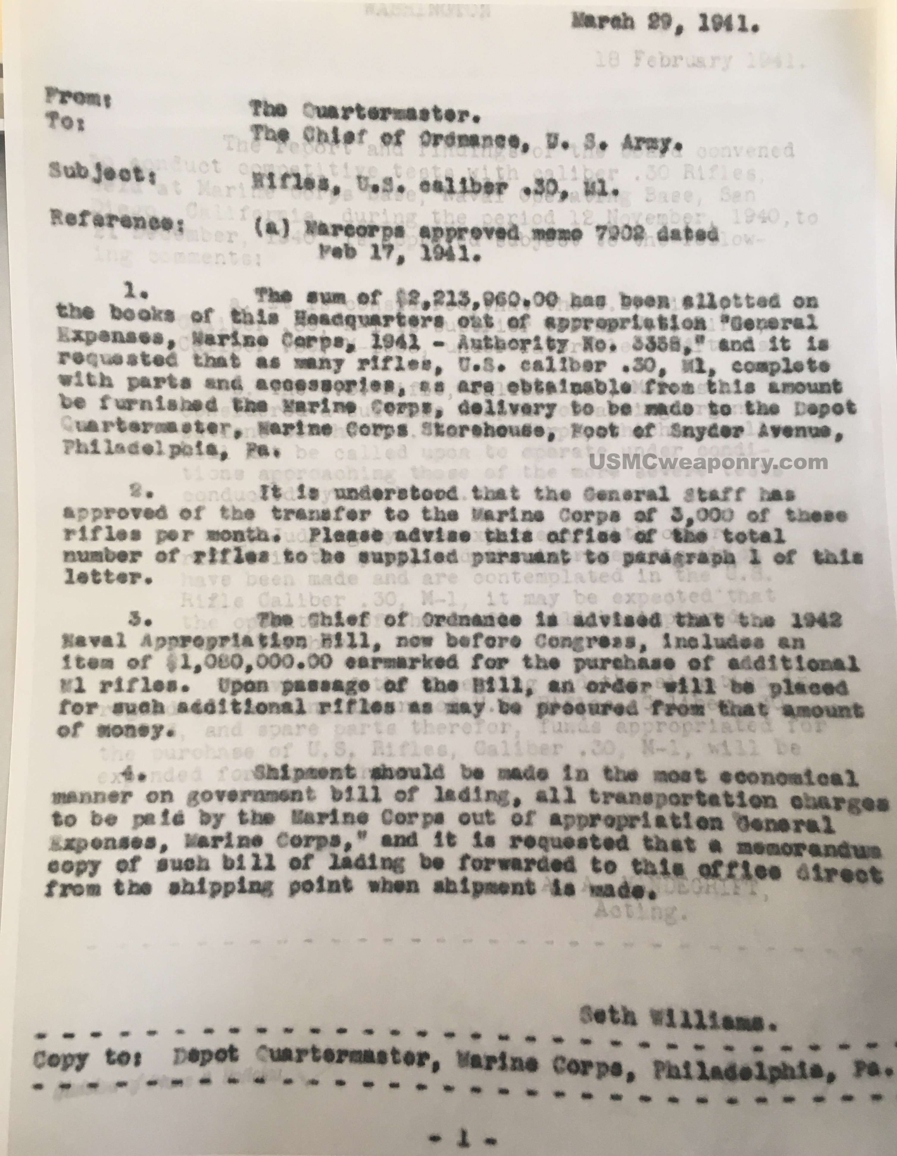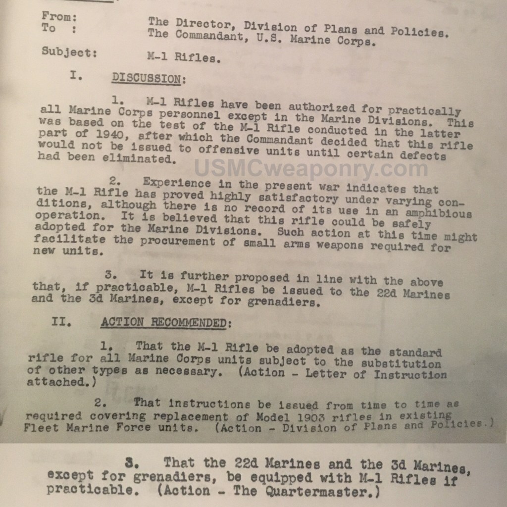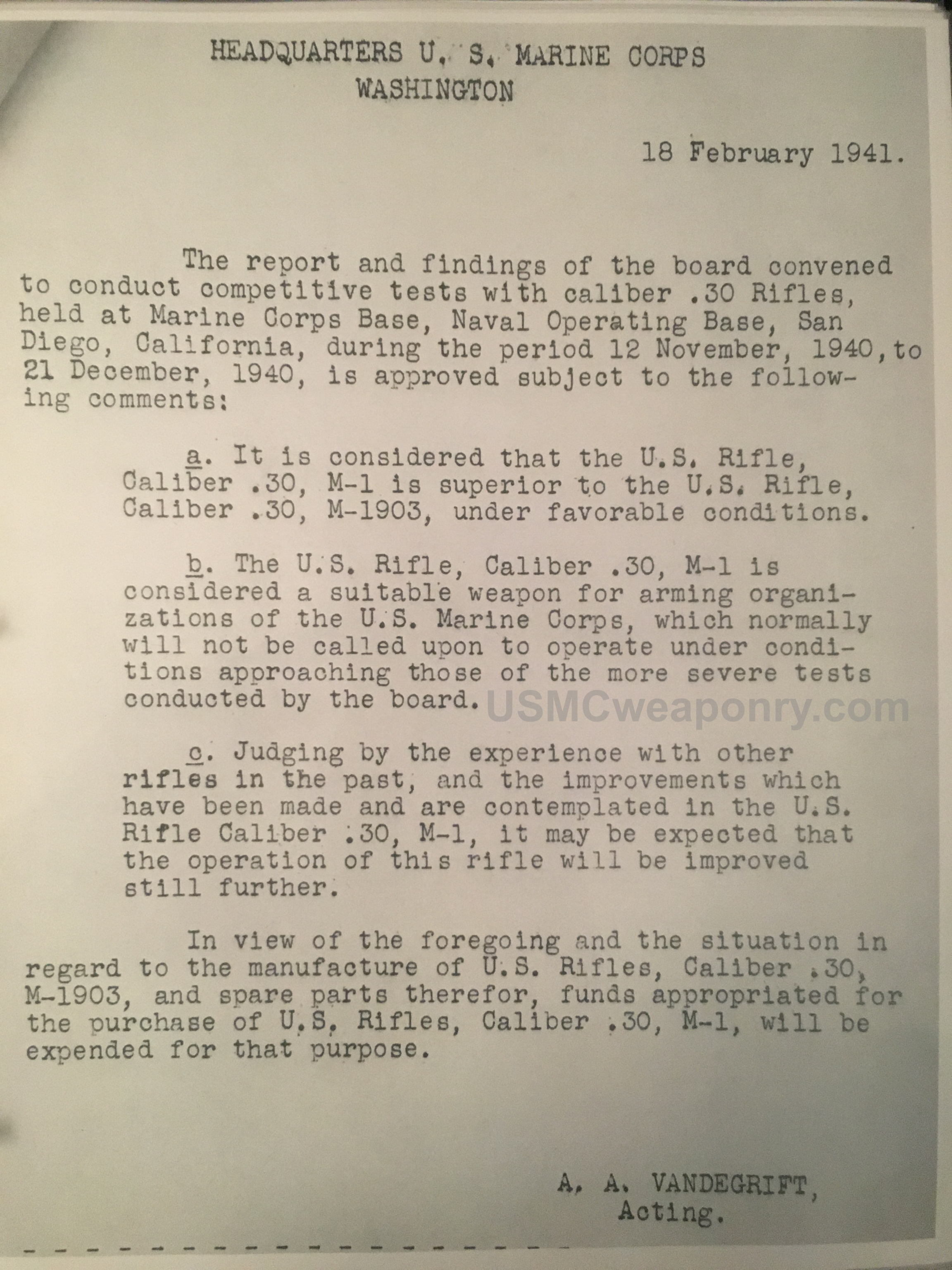 Documents detailing the adoption and implementation of the M1 Garand by the Marine Corps. The M1 was officially adopted in February of 1941, and the first units to be armed would be stateside guard units. Not long after, larger acquisition and broader issue of the M1 was recommended (NARA).