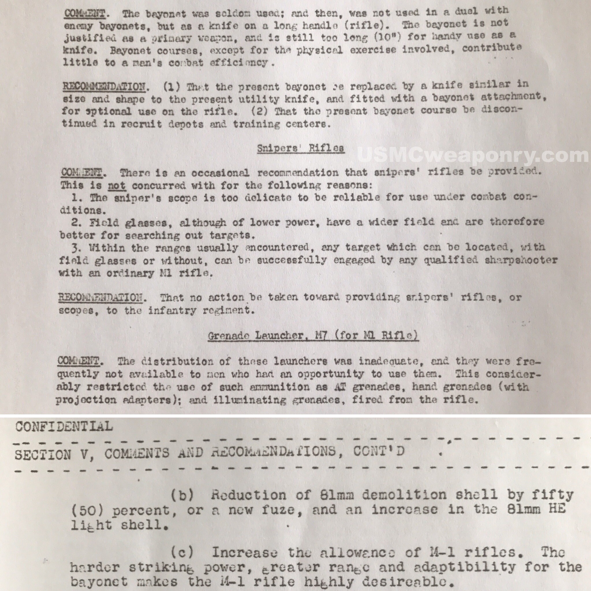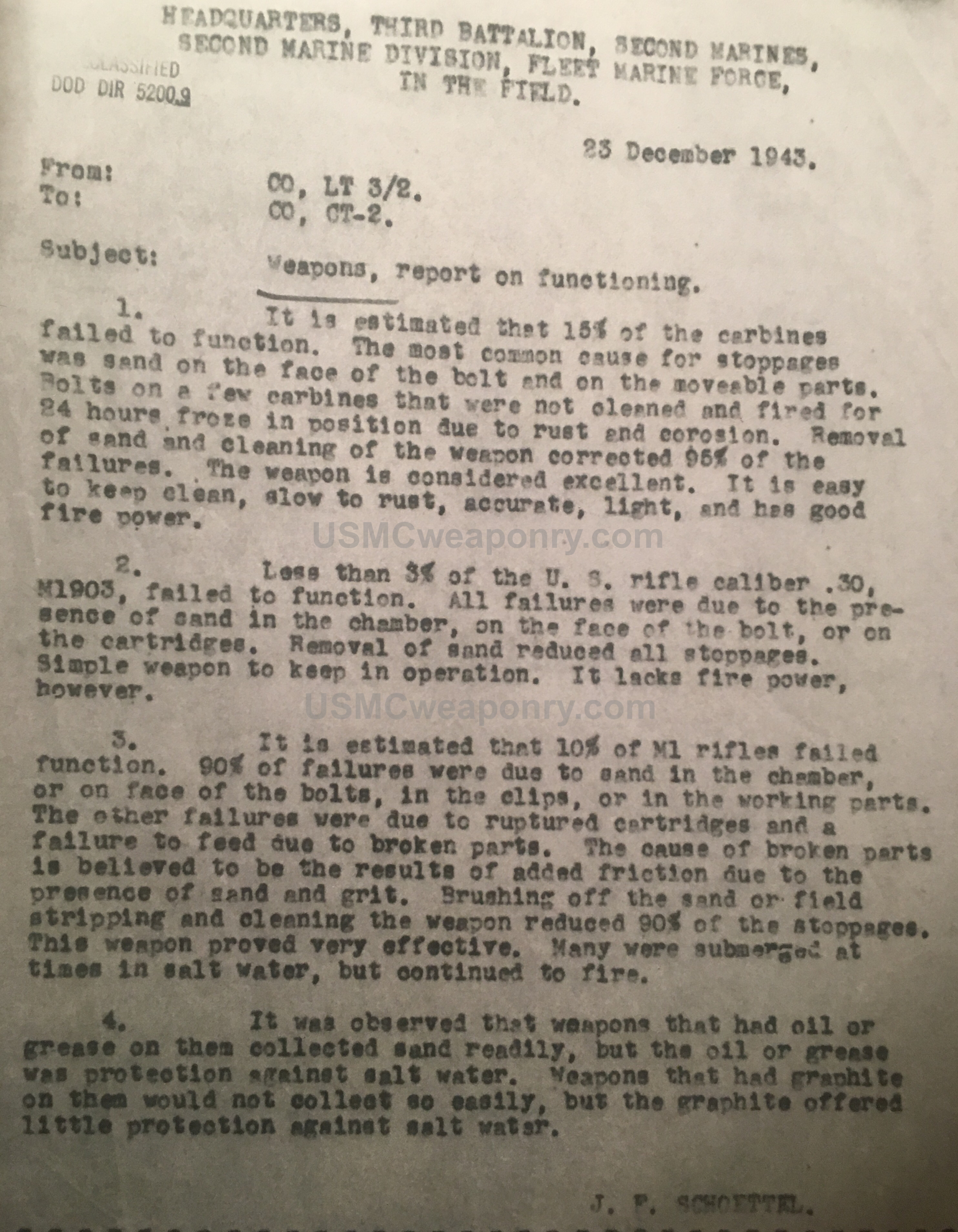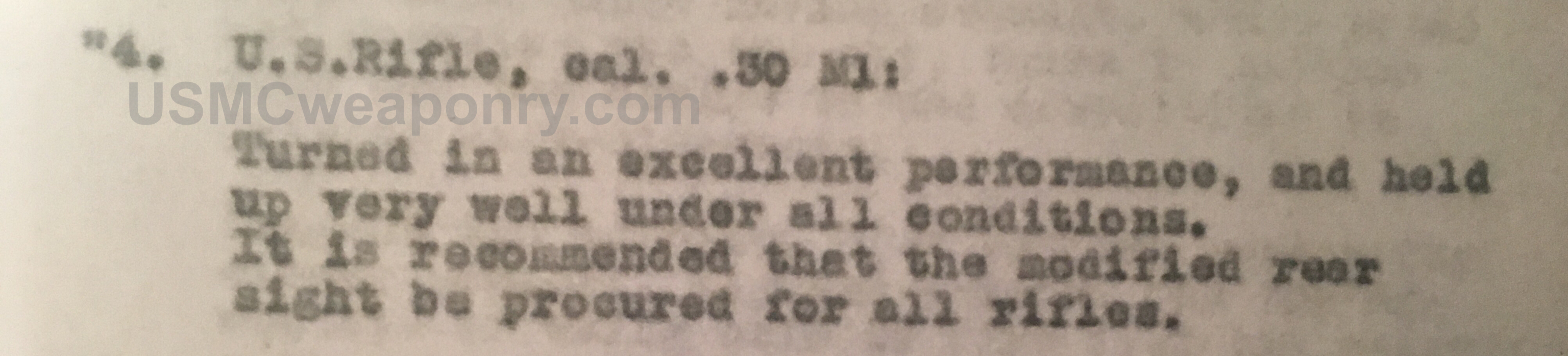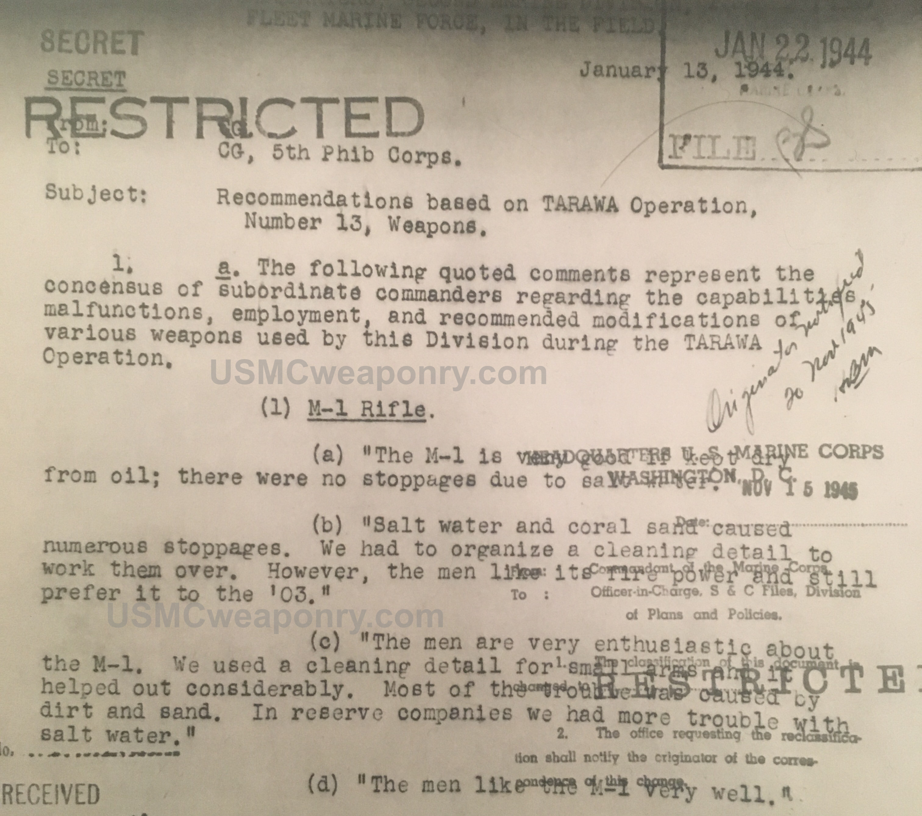 Top: After Action Report from the Marine Raiders on New Georgia; the modification referred to is either the cutting of a V shaped notch into the rear sight aperture, or enlarging it. Bottom: The Battle of Tarawa was a marquee engagement at the heart of the Marine Corps’ amphibious mission, and the reports of the M1 Garand’s performance in a gritty, salty environment showed it was more than up to the task (NARA).
