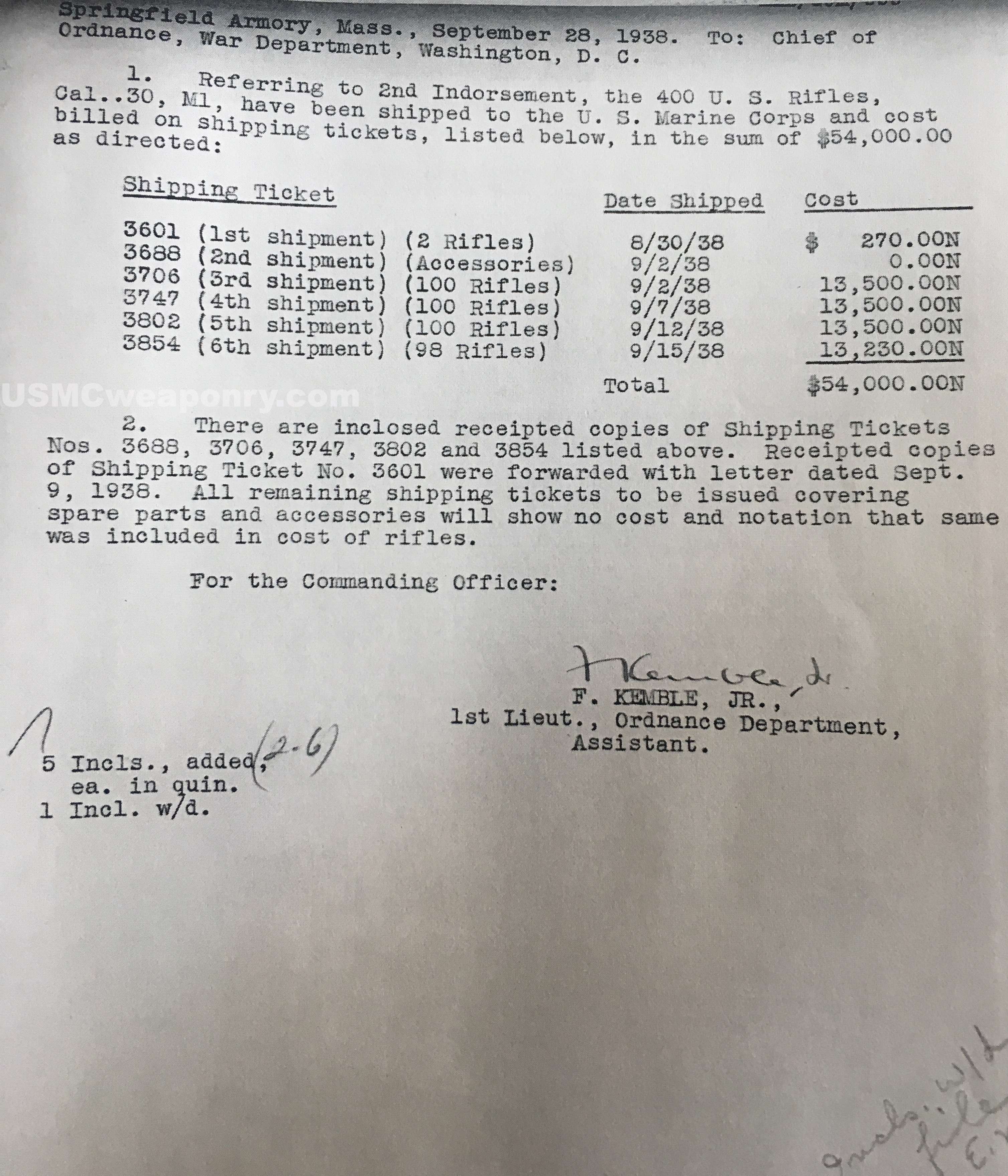 Pictured is John C. Garand, the inventor of the US Rifle, Cal .30, M1, and the first order of the rifle sent to the Marines for testing (NARA).