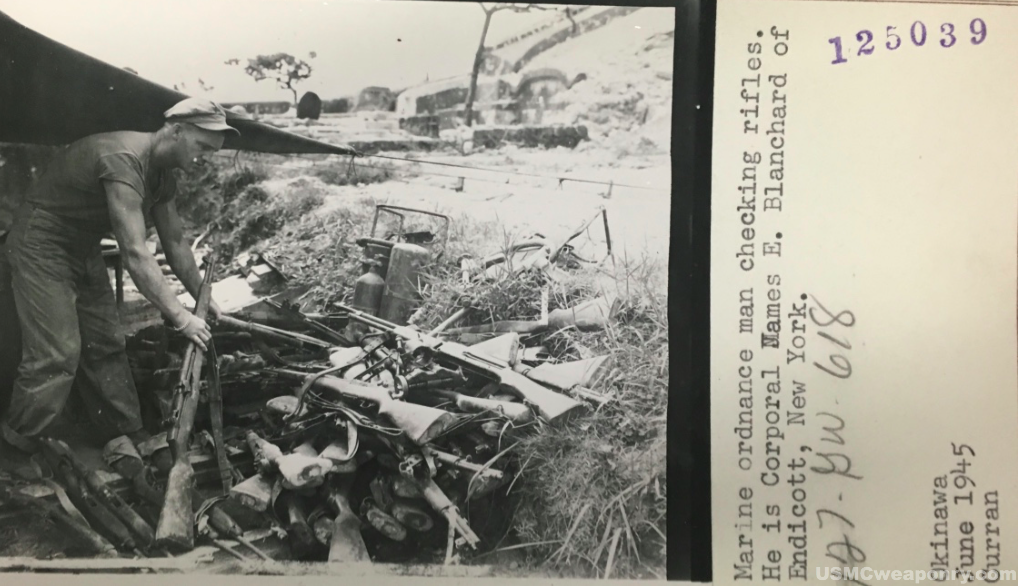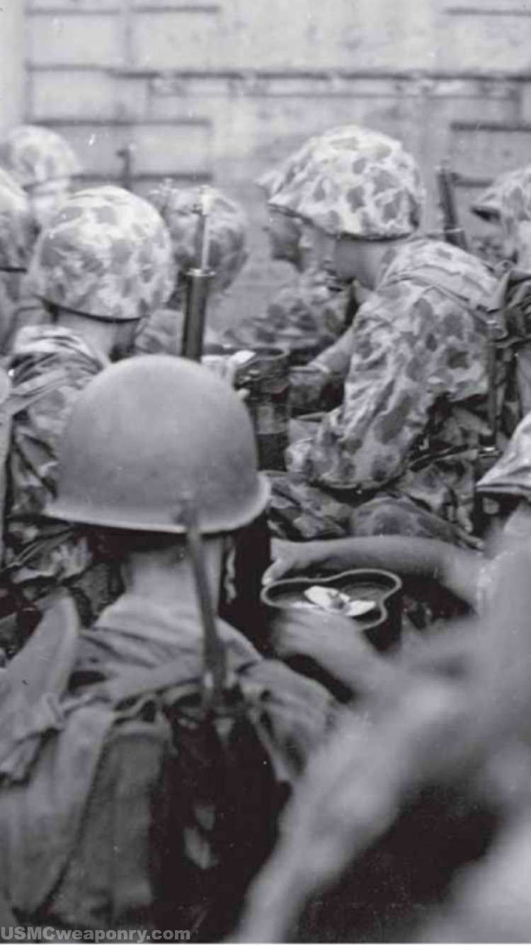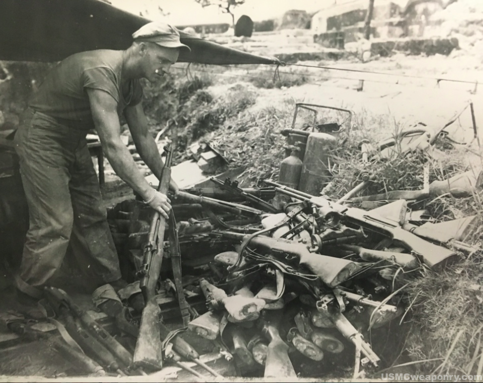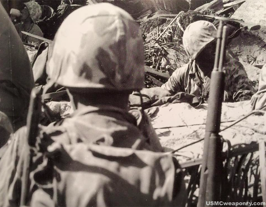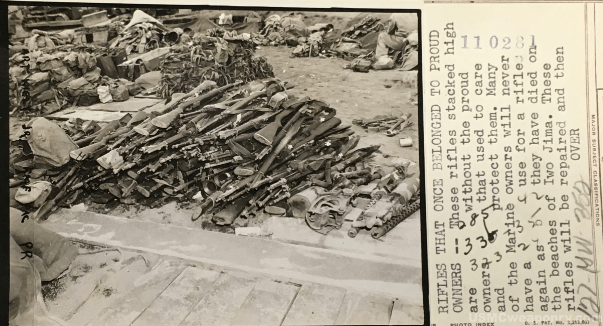 M1 Garands in the hands of Marine riflemen during the Battle of Iwo Jima. The piles of weapons stacked high would be fixed, cleaned and reissued to the men on the front lines during the battle (NARA).