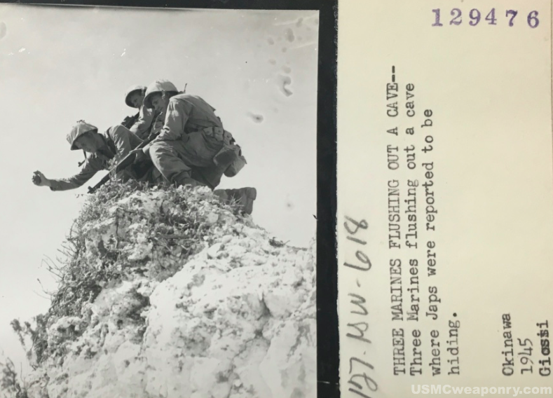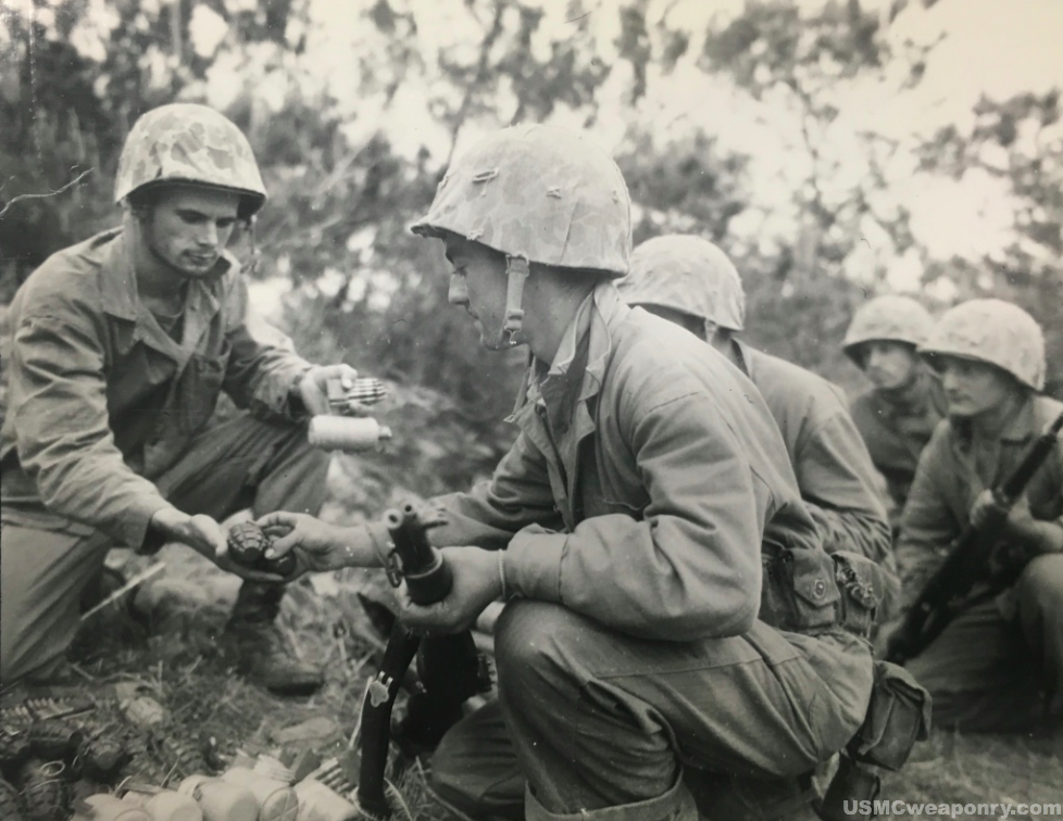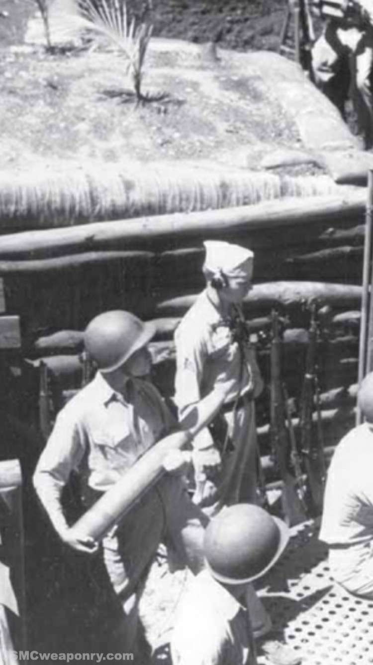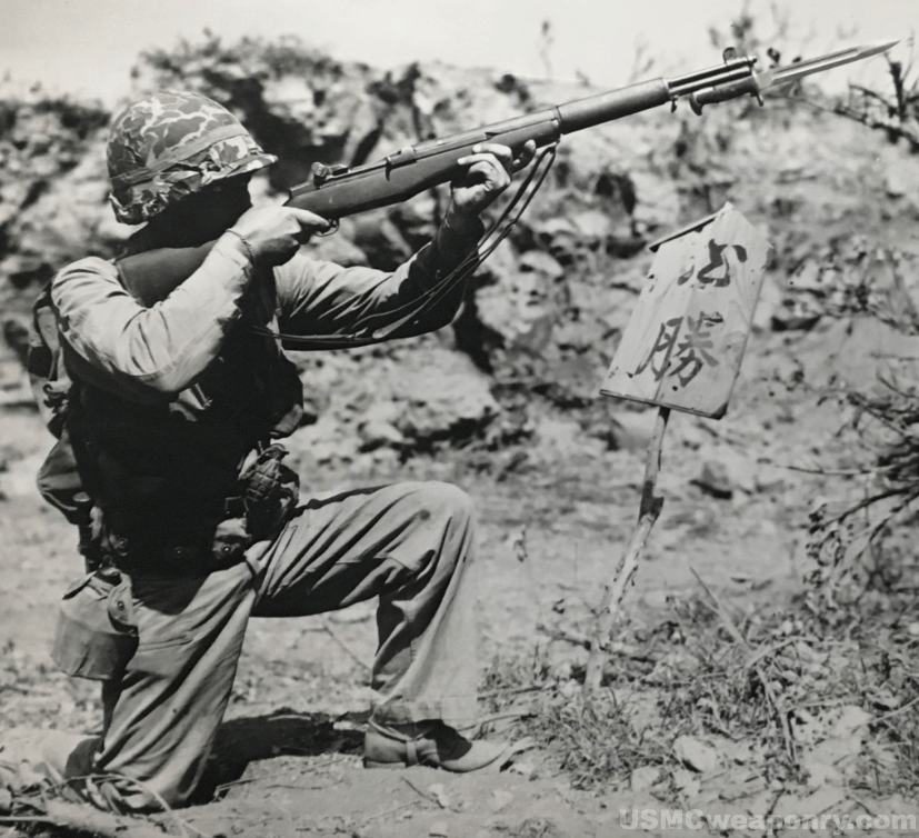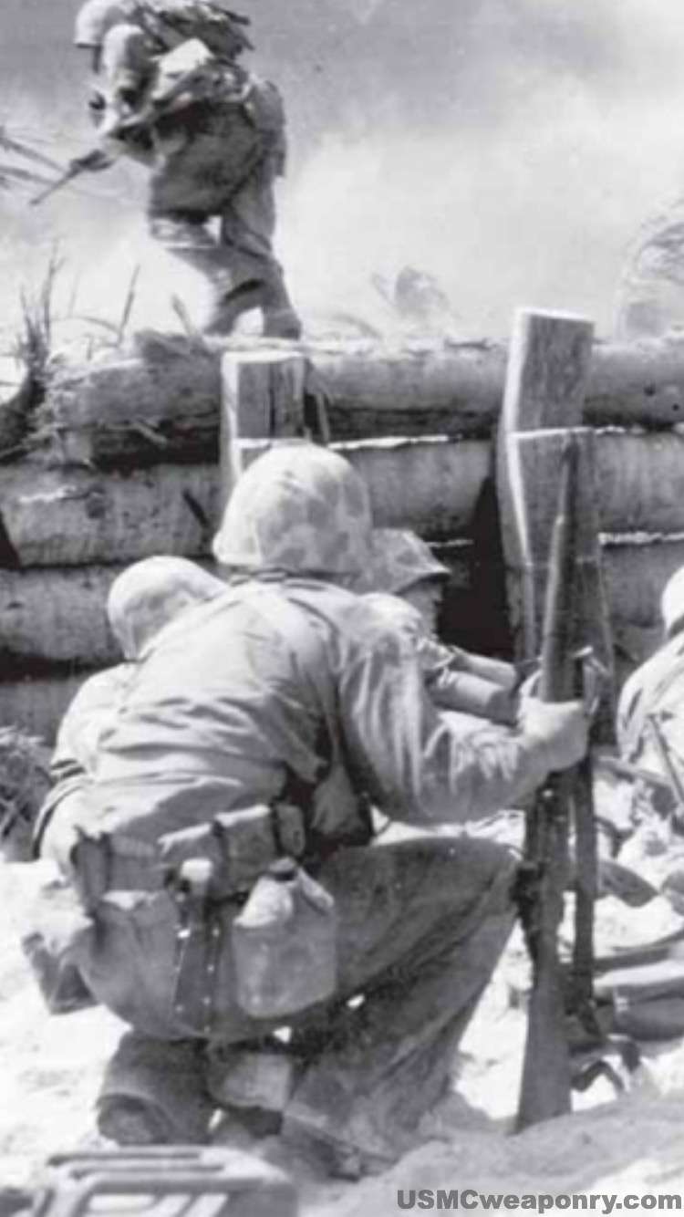 The M1 Garand would receive very few comments related to needed changes from the battlefield. Most would revolve around its attachments, namely the bayonet and grenade launching adapters. The realities of how the bayonet was used led to a continuous shortening, with the 16 inch M1905 bayonet being shortened to 10 inches, and later to 7. While both 16 and 10 inch bayonets are observed on Iwo Jima, the 10 inch version is a bit more prevalent in photographs The M7 grenade launcher was well received, and most comments about it were about there not being enough to go around, as small unit leaders believed it would be best for there to be one per squad. The early M7 grenade launcher was a stand-alone design that required the shooter to use “Kentucky windage,” thus guessing the appropriate arc when firing. Late in the war the M15 sight was developed, implementing a level and peep sight system. Most M15s were too late for World War II issue however, and the M7 would be employed until the end of combat operations.