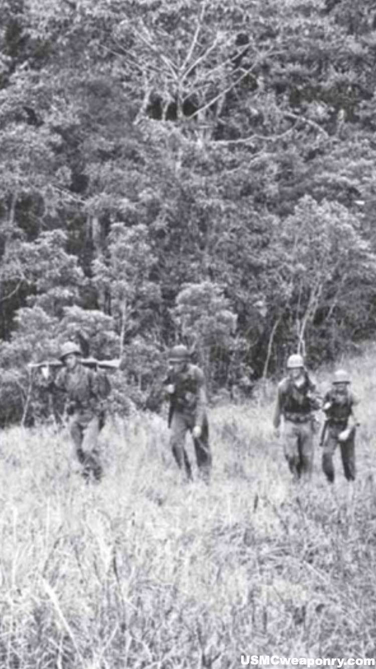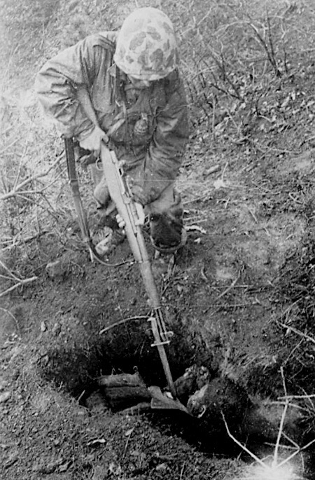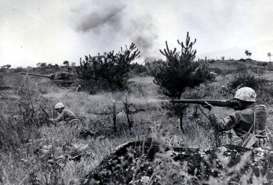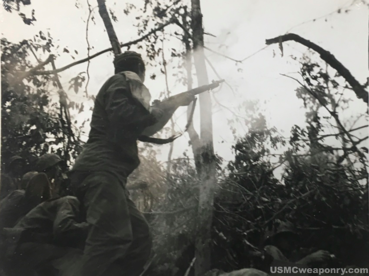 Photo of Marine infantrymen in combat in Korea in 1952. The Marine Corps continued to use lock bar sights during the Korean War (NARA).