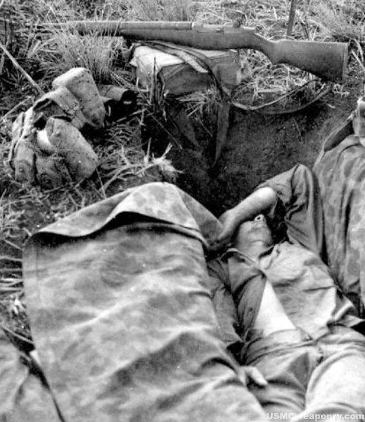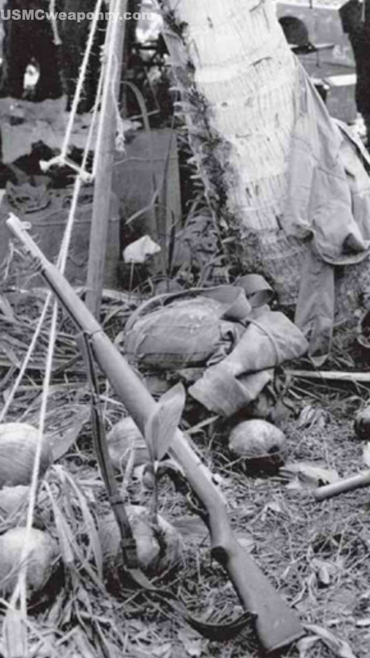 Hindsight being what it is, its very safe to say any potential issues the M1 was thought to have in amphibious operations were greatly overestimated during USMC testing in 1940 & 1941. The Marines indeed had the ability and rifles available to have fully equipped the infantrymen of the 1st Marine Division with M1s had they so chosen, and the added fire power would have been quite welcome against the Japanese banzai charge. To that regard, there are photos of a 3rd Battalion, 1st Marine Regiment (3/1) fighting hole with an M1 Garand resting outside on the day after the Battle of Edson’s Ridge. 3/1 was never issued M1 Garands, leaving the most source of this rifle by unknown means within the 1st Marine Division. While stories of M1s being “acquired” from the army’s 164th Infantry Regiment have long been told, the army was yet to land on Guadalcanal, leaving the source of the unlikely Garand (which also is fitted with a unique USMC depot made M1907 sling) solely Marine Corps in origin. It is a practical certainty though that Marines did get “resourceful” in adding the new rifle on their own accord from army supplies later in the campaign when the chance arose.