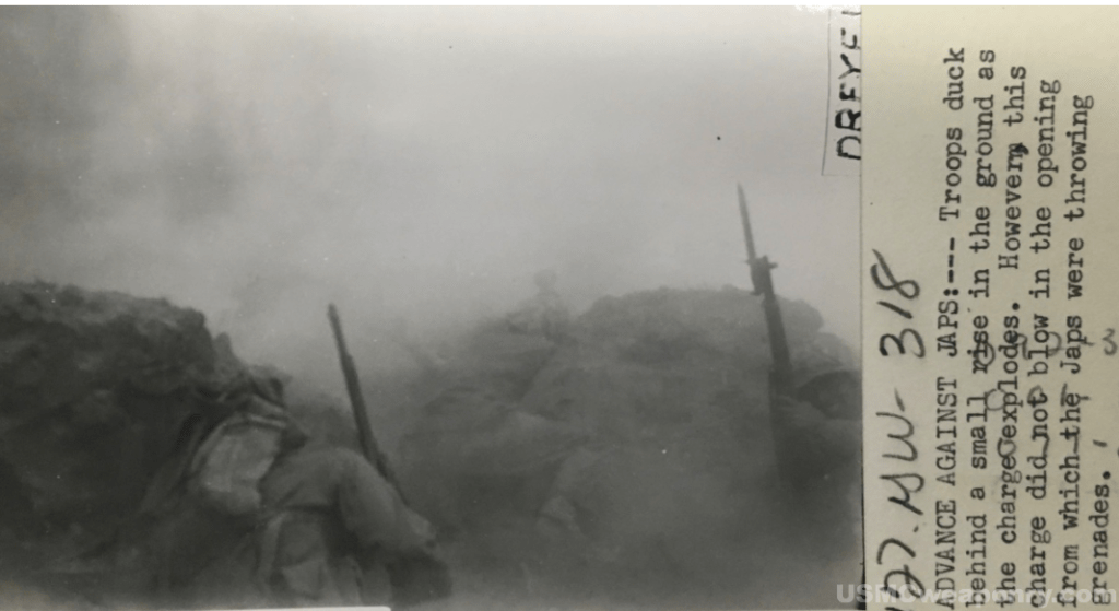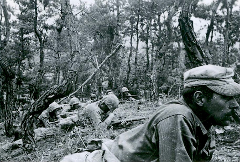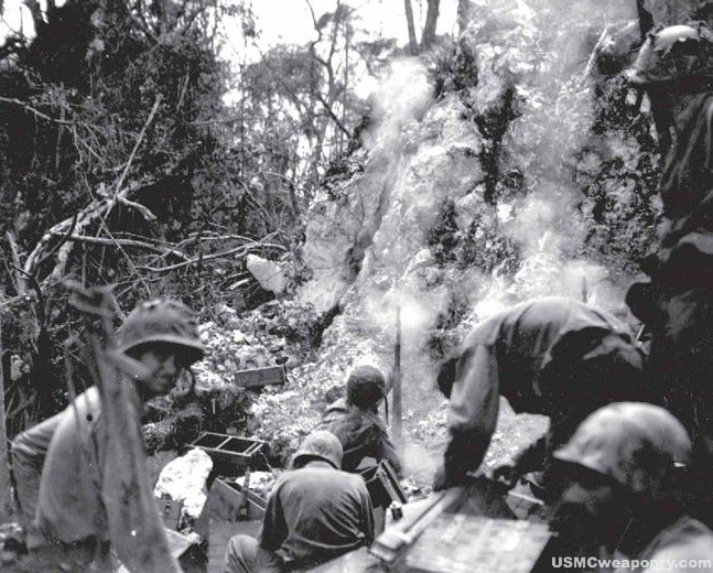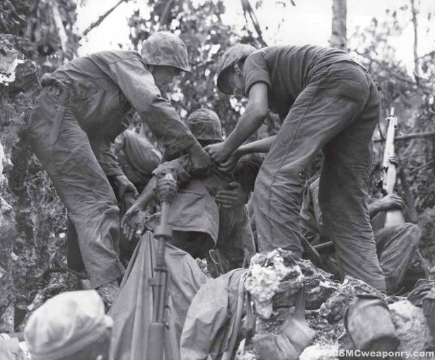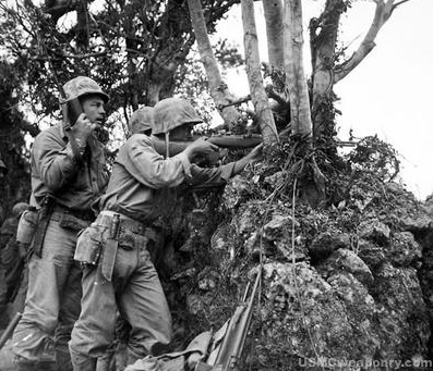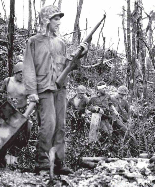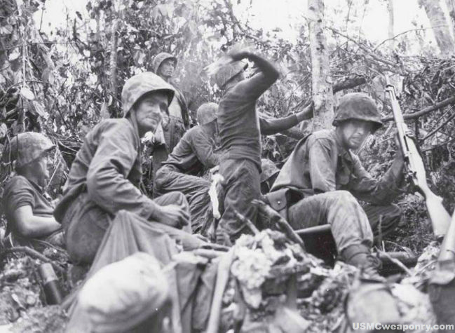 Marines with M1 Garands fighting in the jagged crags of the mountains on Peleliu, places with name like Suicide Ridge and Bloody Nose Ridge (NARA).
