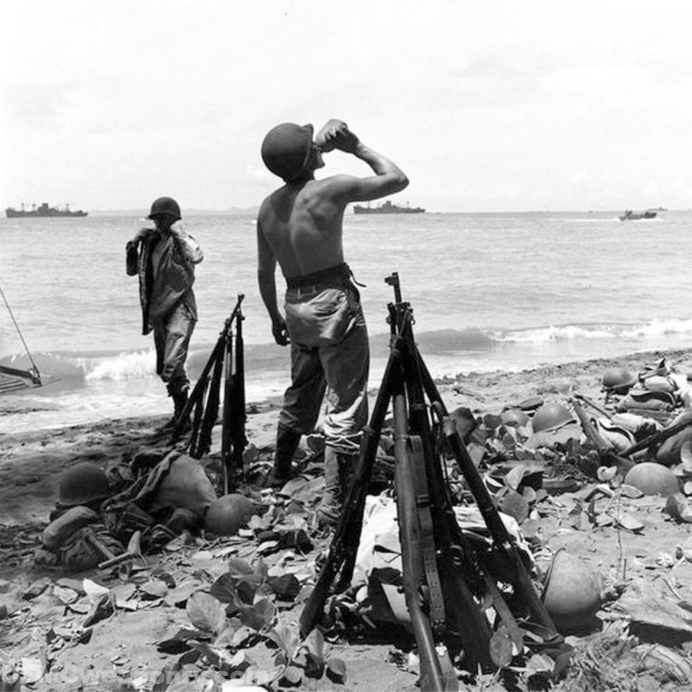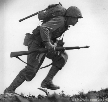 Arguably the most iconic photograph of the war, the M1 Garand can be seen prominently slung over the shoulder of PFC Harold Schultz (NARA).