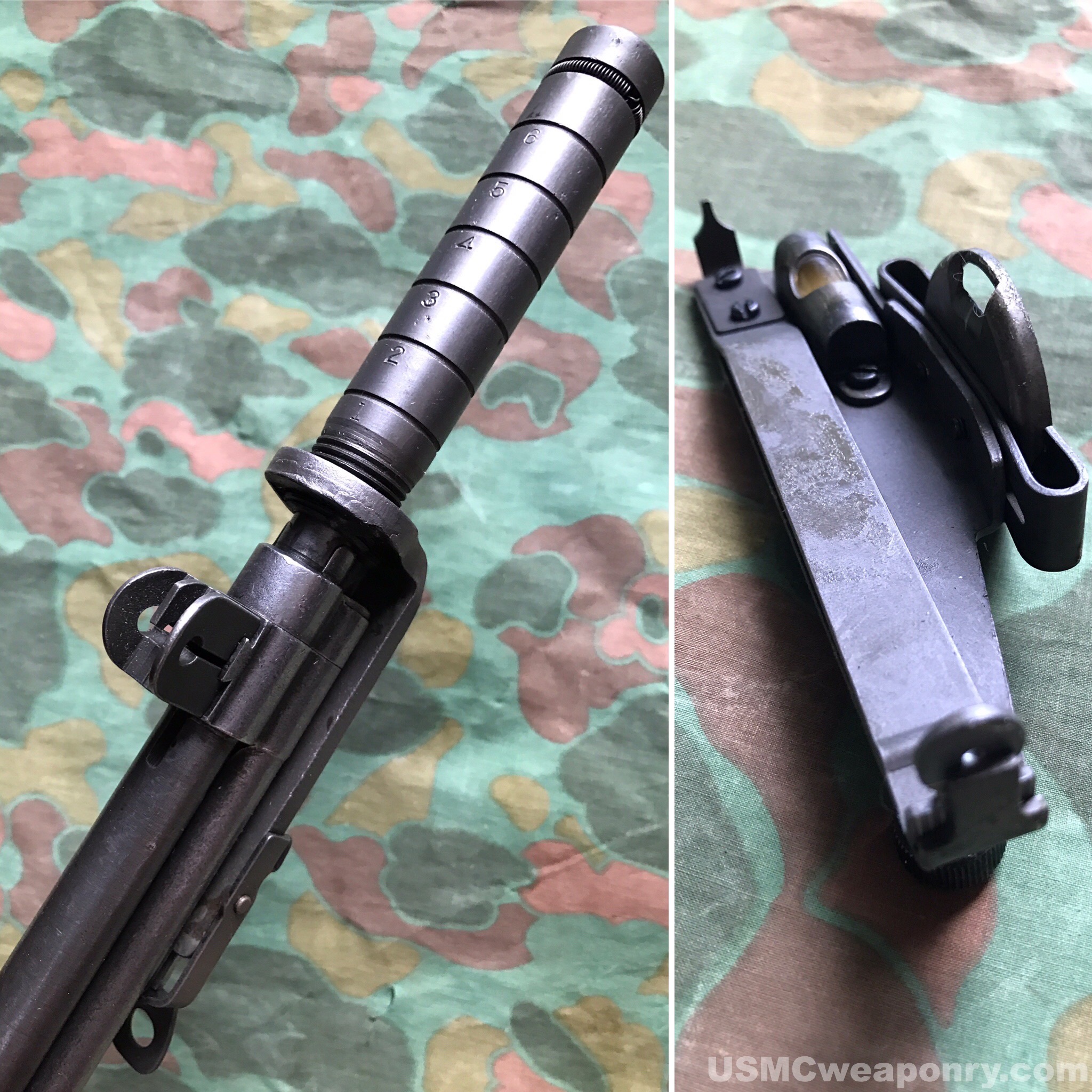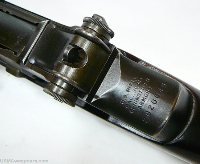 The USMC M1 Garands of the Korean War were practically identical to the ones of World War II. The M1 rebuilds following the war’s end were with standard parts, and it does not appear the Marine Corps used any rebuild markings at this time. Perhaps the only noticeable difference between a USMC M1 Garand in the Korean War and those of the army were the rear sights. The Marine Corps continued to use the lock bar sight throughout Korea, believing this would better ensure a secure zero that could be be accidentally moved out of place. This practice eventually went away in the mid-50s, and the T105 sight would be used on the last rebuilds of Marine M1s.