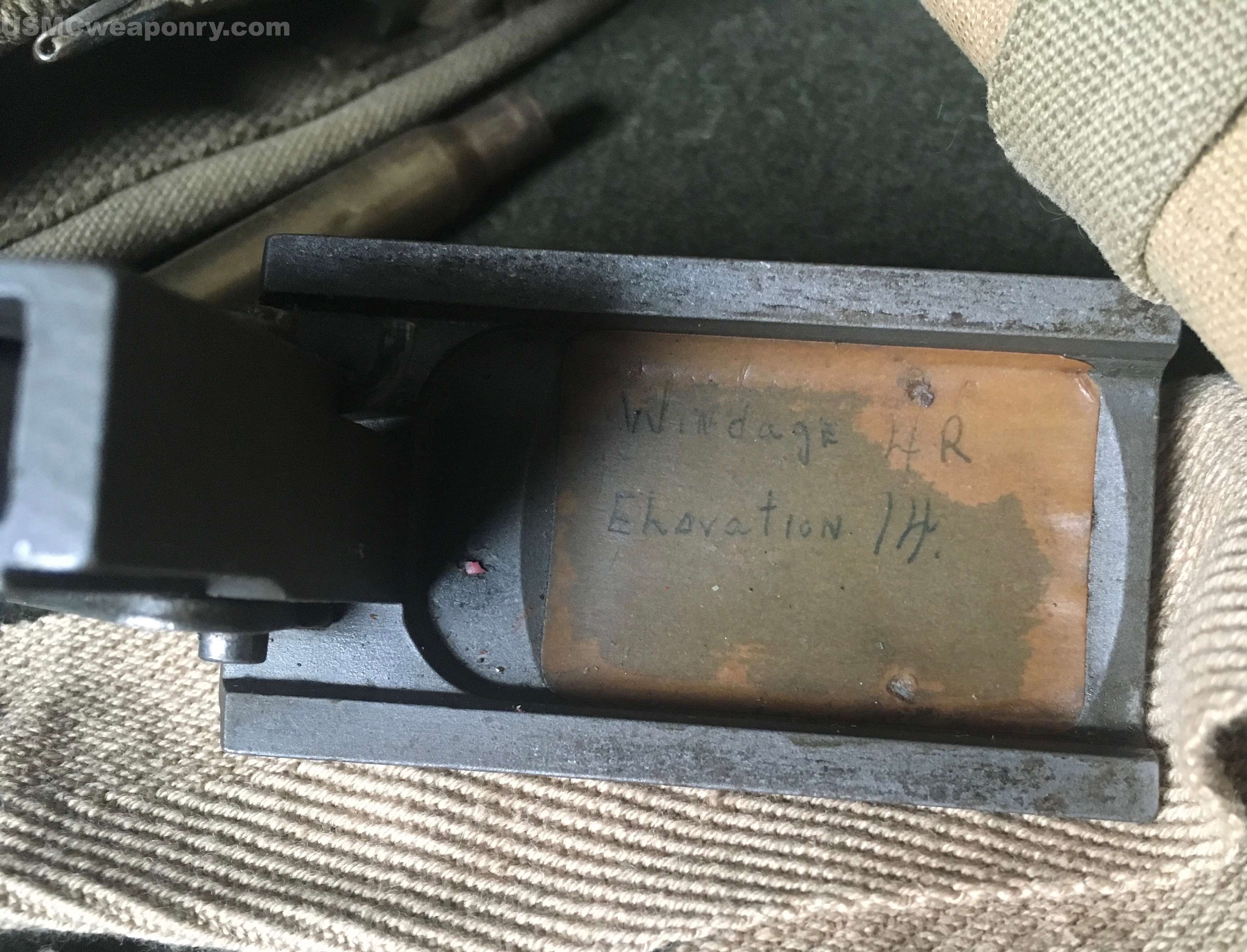USMC 1.14 million range Springfield Armory M1 Garand, with “DOPE” tag stating the Marine’s Battle Sight Zero (BZO) on the inside of the trigger housing. The Marines practiced including a dope tag with every M1 Garand and a variety of types have been seen, most commonly in the butt trap or the trigger housing.