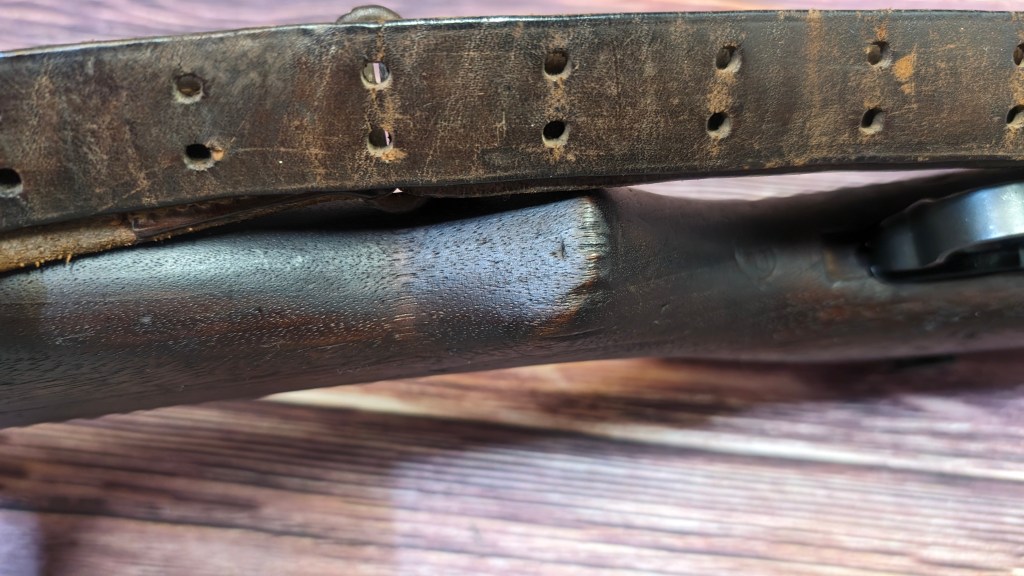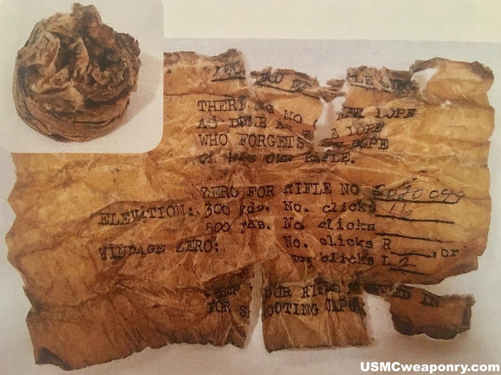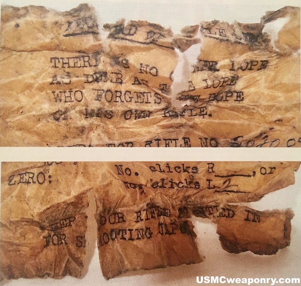 Another excellent example of USMC M1 Garand DOPE tags, this piece of paper recording the Marine’s rifle zero was discovered in Major Moore’s M1 Garand’s stock. Wedged into the trap hollowed out for cleaning gear, it reads “There is no other dope as dumb as the dope who forgets the DOPE on his rifle,” and on the bottom “keep your rifle sighted in for shooting Japs,” as well as the zero and M1’s serial number.
