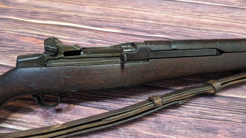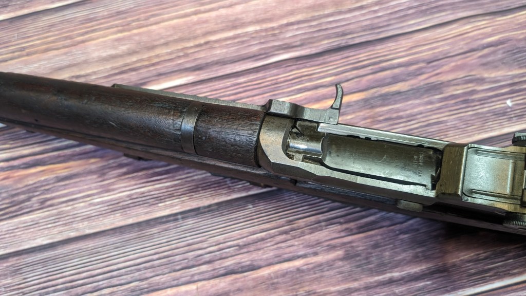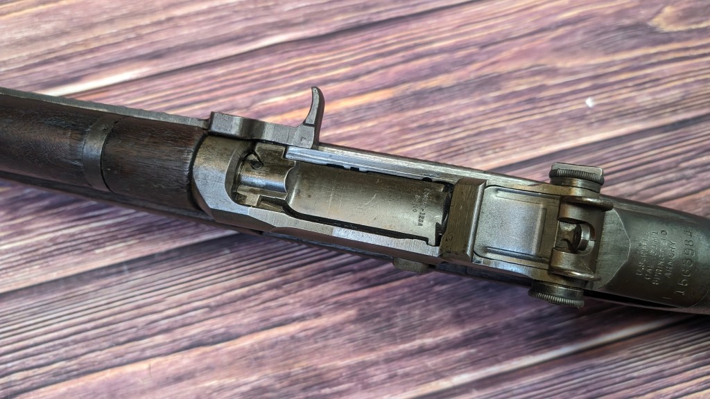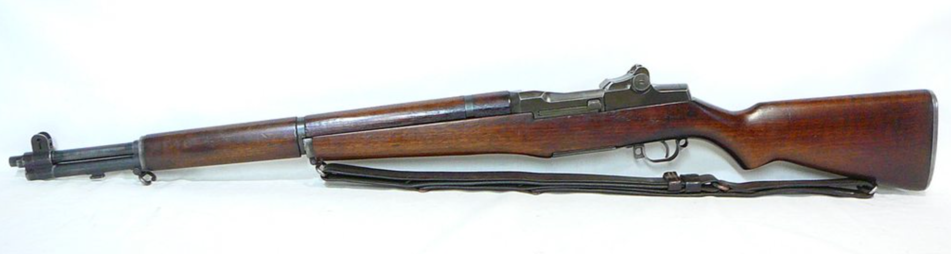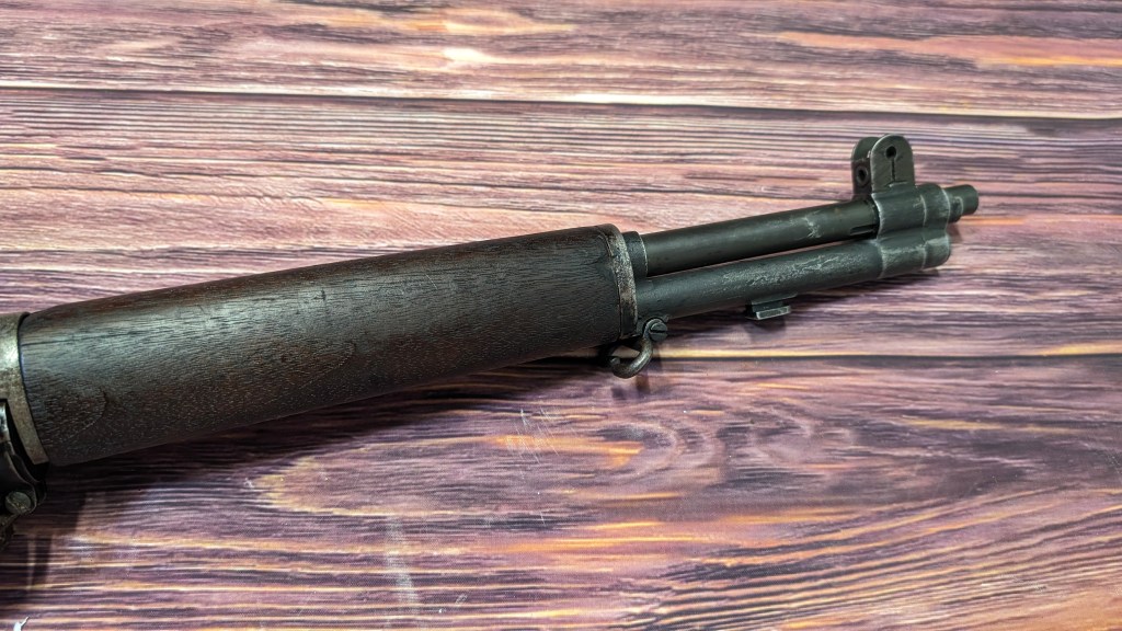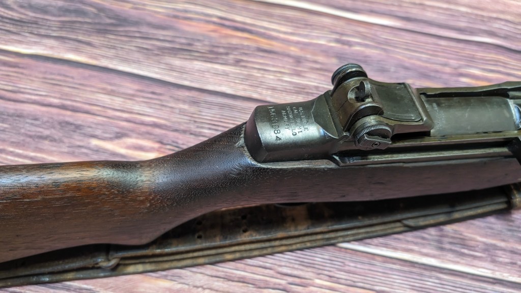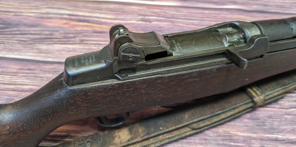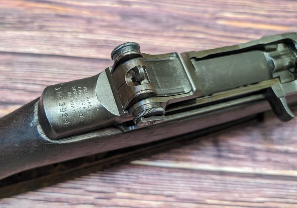 Early Springfield Armory M1 Garand with “flush nut” rear sights and improved gas cylinder (Norton collection).